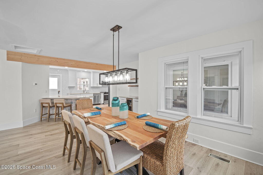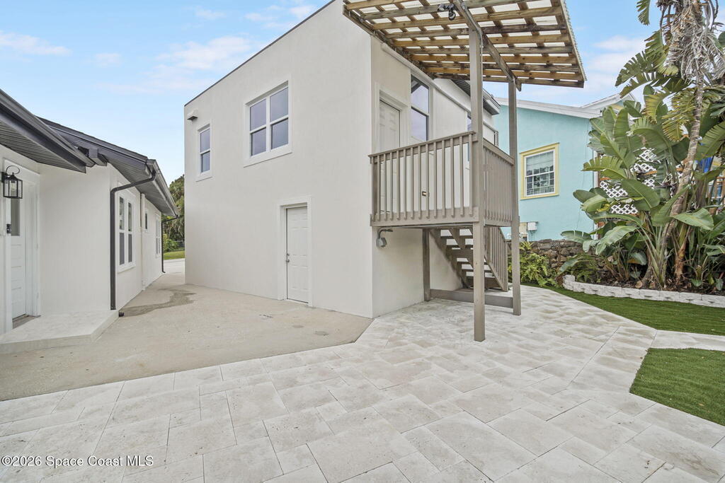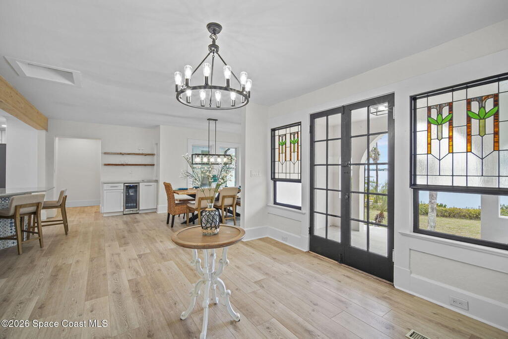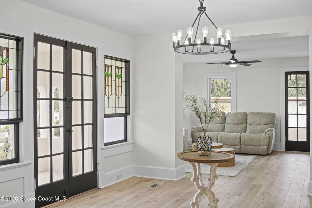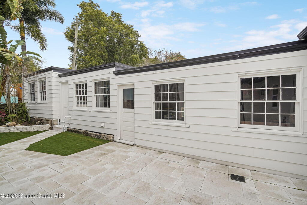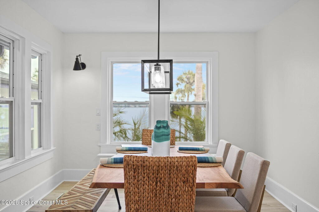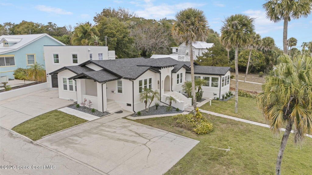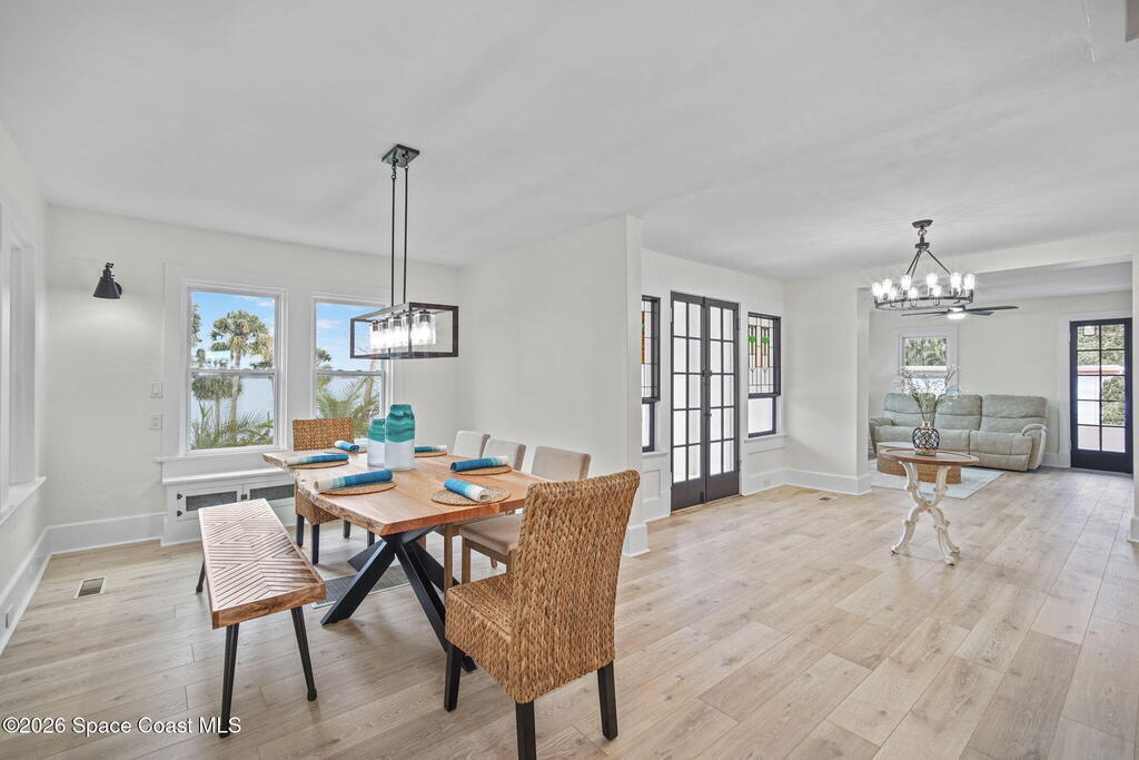 Set along the scenic Indian River, this exceptional riverfront residence blends timeless character with thoughtful modern updates, all within walking distance to Cocoa Village. Set high above the Indian River, the home offers peace of mind along with river views which can be enjoyed from your dock that is built out half way. The remodeled main residence features 3 bedrooms, 2 bathrooms, with a remodeled 520 square foot one-bedroom, one-bath apartment above the two-car garage--ideal for guests or extended living. Extensive upgrades include: New roof (2023), 47 hurricane impact windows, modern garage door, new floording throughout, and new lighting fixtures. Remodeled kitchen features new cabinetry, quartzite countertops, new appliances, an island with seating, and a hidden butler's pantry with laundry. Home has a split bedroom floor plan. Master suite has a walk-in closet, separate sitting area, dual head shower, and automatic roller shades. Comes fully furnished. Truly a must see!