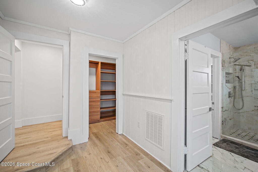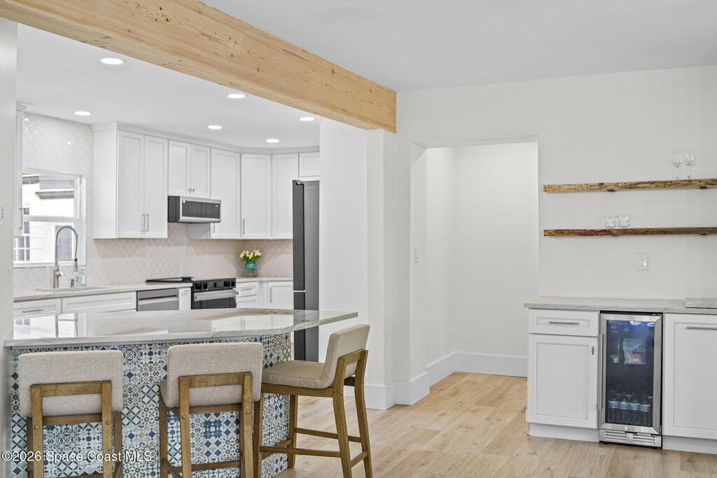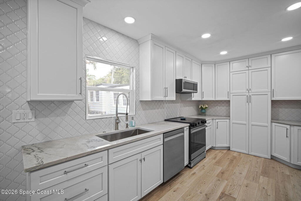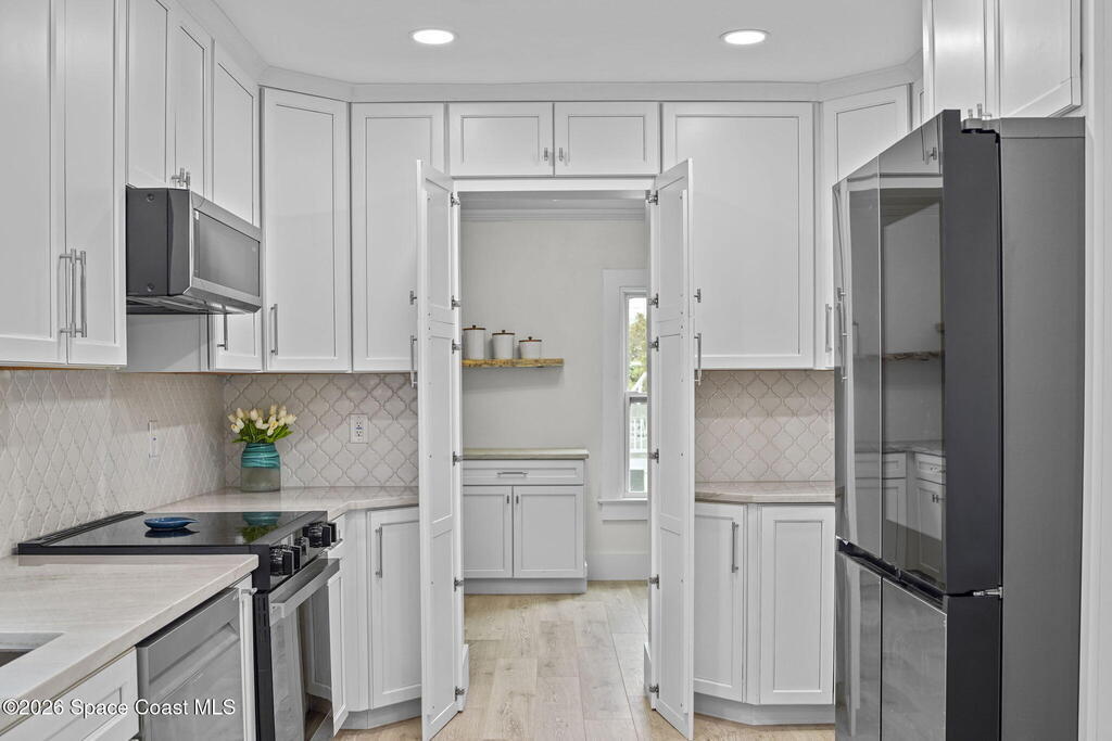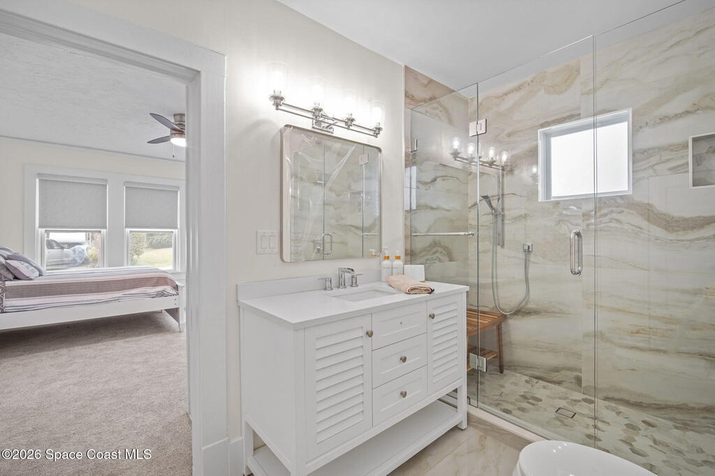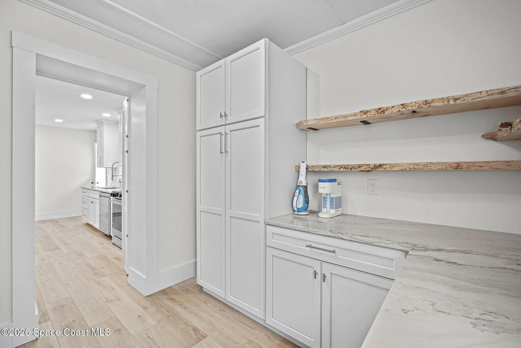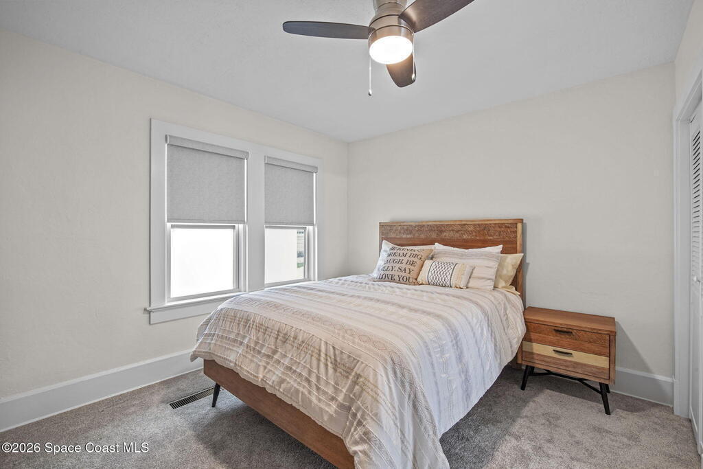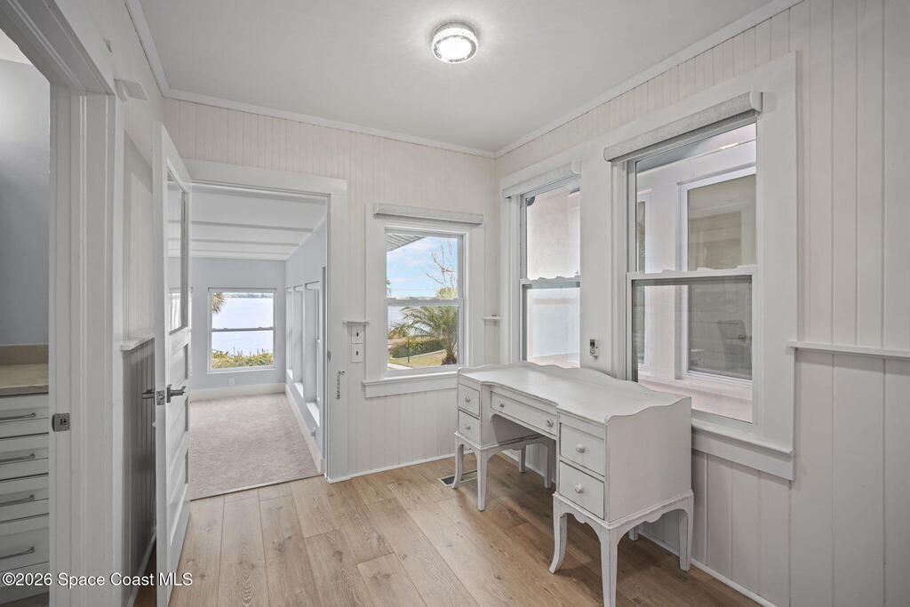 Set along the scenic Indian River, this exceptional riverfront residence blends timeless character with thoughtful modern updates, all within walking distance to Cocoa Village. Set high above the Indian River, the home offers peace of mind along with river views which can be enjoyed from your dock that is built out half way. The remodeled main residence features 3 bedrooms, 2 bathrooms, with a remodeled 520 square foot one-bedroom, one-bath apartment above the two-car garage--ideal for guests or extended living. Extensive upgrades include: New roof (2023), 47 hurricane impact windows, modern garage door, new floording throughout, and new lighting fixtures. Remodeled kitchen features new cabinetry, quartzite countertops, new appliances, an island with seating, and a hidden butler's pantry with laundry. Home has a split bedroom floor plan. Master suite has a walk-in closet, separate sitting area, dual head shower, and automatic roller shades. Comes fully furnished. Truly a must see!