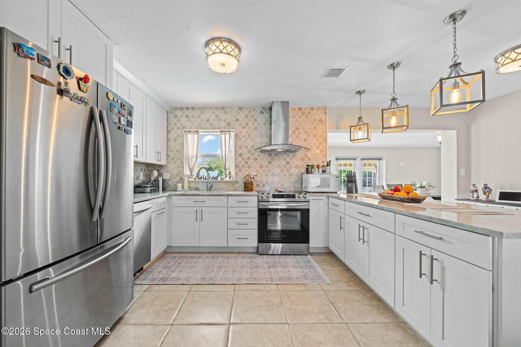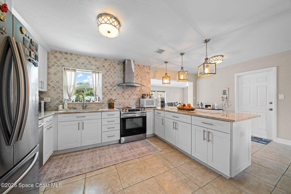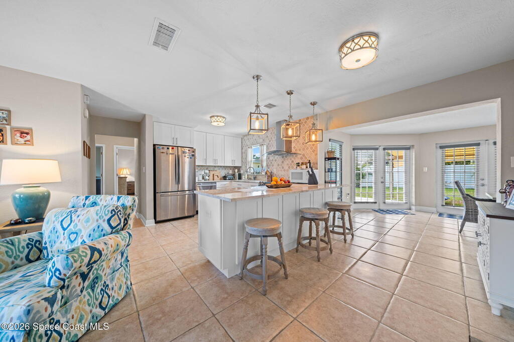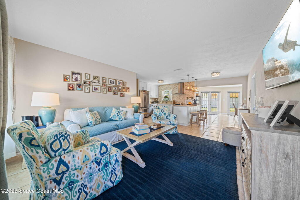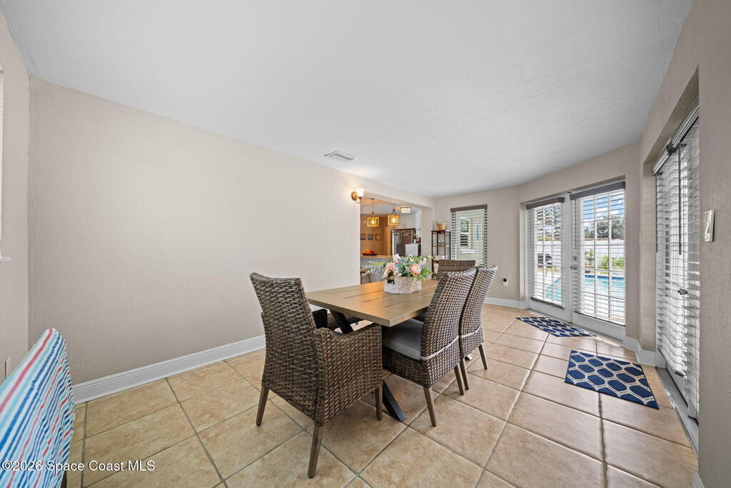 GORGEOUS POOL HOME IN MERRITT ISLAND! A picture perfect 3 bed/2 full bath home on an OVERSIZED LOT has an OPEN FLOOR PLAN with living room, spacious dining area or extended family room area with DOUBLE FRENCH DOORS that lead out to a LARGE FENCED IN BACKYARD with PRIVATE INGROUND SALTWATER POOL. This super cute home is in a wonderful quiet neighborhood and has updates galore to include; a brand new beautifully updated kitchen, quartz counters, tile backsplash, new stainless appliances, brand new designer lighting, tile throughout, updated baths, freshly painted interior & exterior, refinished pool, all new impact windows, new doors & baseboards, new white vinyl fence, a utility room w/washer & dryer, hvac is 2021, HWH is 2018 and roof is 2018! The extra-large backyard is perfect for entertaining or plenty of room for the kids & pets to play! This move in ready home is a great investment or a family/vacation home! Only 10 min to the beach, 40 min to MCO & theme parks, 20 min to KSC!