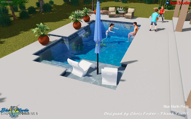 TO BE BUILT, City Water, 1.73 acre estate. The Alexander offers 4 bedroom suites with private bathrooms, a study, and an expansive open great room and kitchen. Features include a resort-style pool with sunbench, umbrella sleeve, and cap. An architecturally designed side-entry three-car garage preserves a clean front elevation while enhancing privacy and arrival flow. 9'4'' ceilings extend throughout the home. The kitchen is appointed with 36-inch upper cabinetry and quartz countertops, which continue into the bathrooms for a cohesive, elevated finish. The primary suite offers dual walk-in closets and a spa-inspired bath with double vanities, a separate shower, and a soaking tub. Over 3,091 SF under air. Floor plan customization available. Images are for illustrative purposes only.