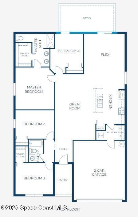 Pre-Construction. To be built. Set within Palm Bay, where outdoor beauty and everyday convenience come together near parks and Florida's renowned beaches, The Marigold presents a thoughtfully planned home designed to support both relaxed living and lively gatherings.The entry foyer opens into a wide, open-concept layout anchored by a generous great room that easily accommodates entertaining and daily routines. At the heart of the home, the kitchen is both functional and inviting, featuring a large center island for casual meals, abundant cabinetry, and a pantry that keeps essentials neatly organized. A nearby flex space adds versatility and can be tailored as a dining area, creative studio, sitting room, or home fitness zone.Glass sliders extend the living space outdoors to an extended rear patio, creating a natural flow for indoor and outdoor enjoyment. The bedroom layout is designed for comfort and privacy, with two front bedrooms sharing a full guest bath
