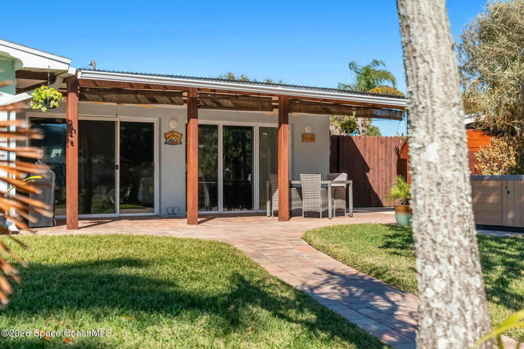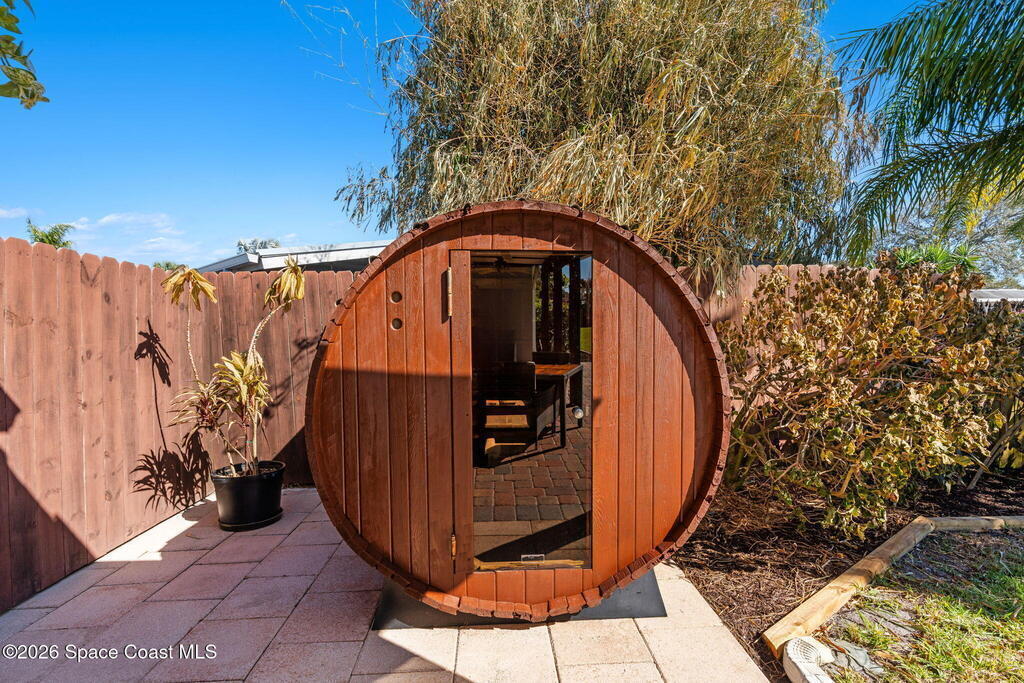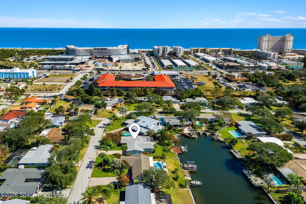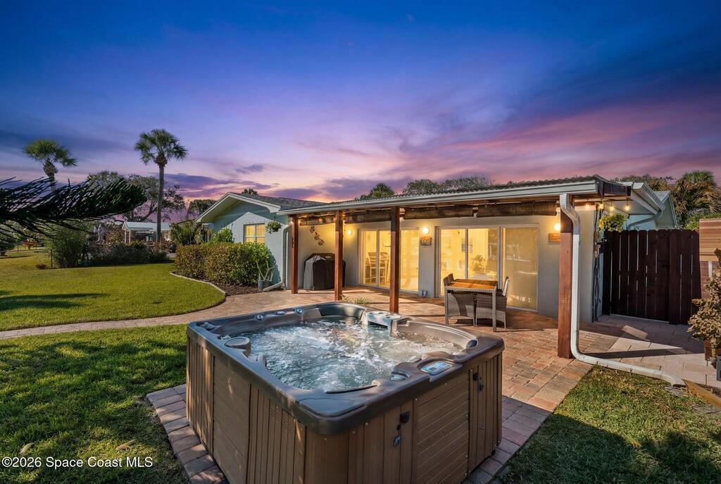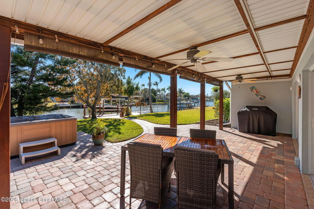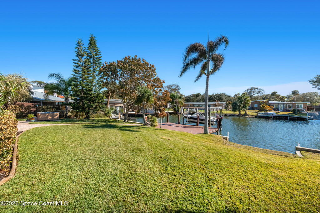 Turnkey canal-front living in one of Cocoa Beach's most favored neighborhoods, Cocoa Isles. This spacious single-story home features an open floor plan, peaceful water views and abundant natural light. Step outside to a large dock, newer boat lift, and be on the river within minutes - perfect for boating, paddleboarding, kayaking, or fishing right from your backyard while dolphins and manatees come to visit. Inside you'll find quartz counters, ''beach-retro'' style cabinets & drawers, SS appliances, keystone propane fireplace, split floor plan, and a comfortable primary suite with updated bathroom and walk-in closet. Major systems have been upgraded including newer roof, A/C, water heater, and 200 amp electrical service. Enjoy your very own wellness oasis, relaxing year-round with a covered patio, hot tub, sauna, and a south-facing water view perfect for sunbathing. Large 2-car garage, reclaimed-water irrigation, and included washer & dryer. Furnishings and decor negotiable.