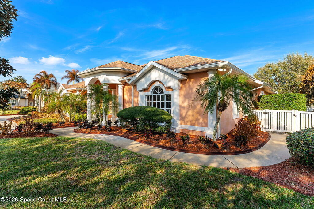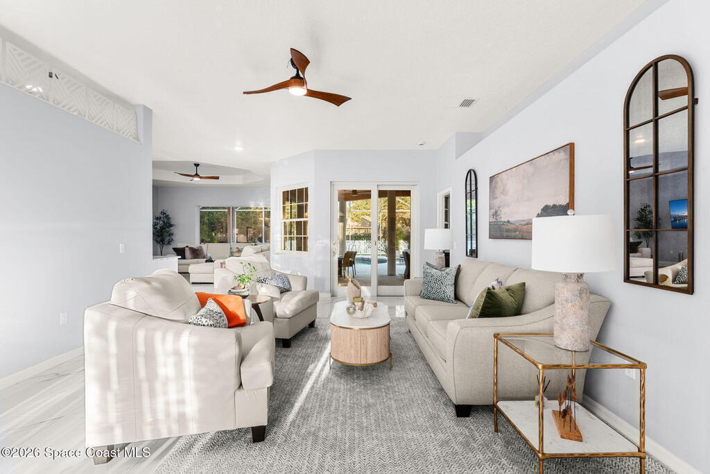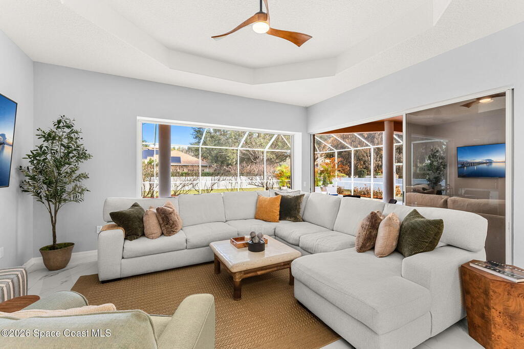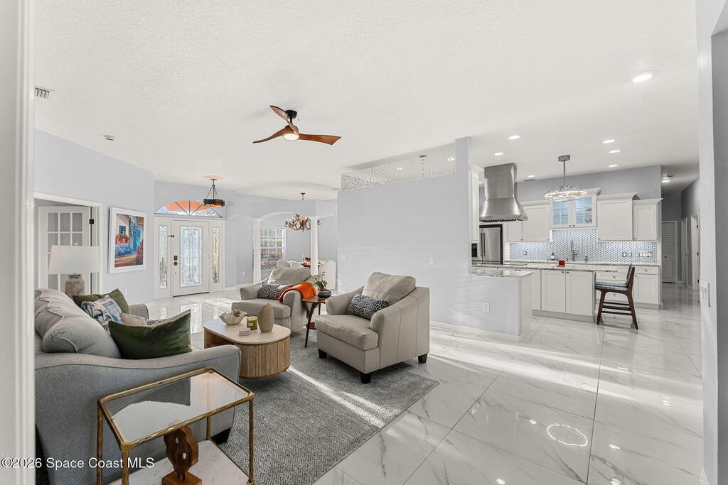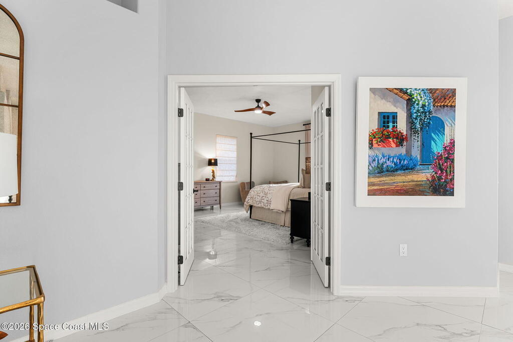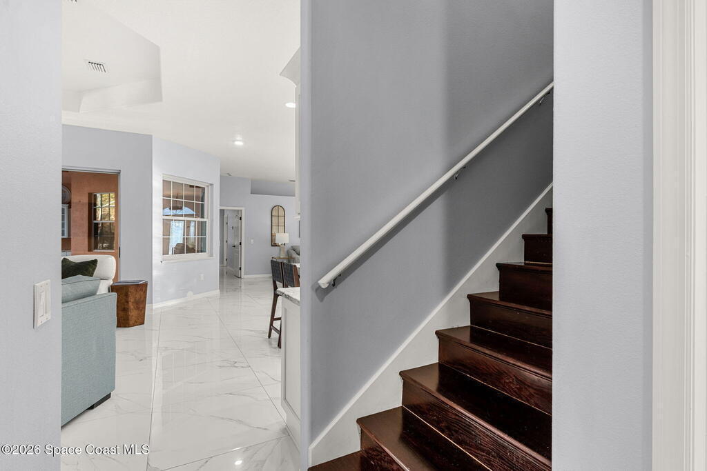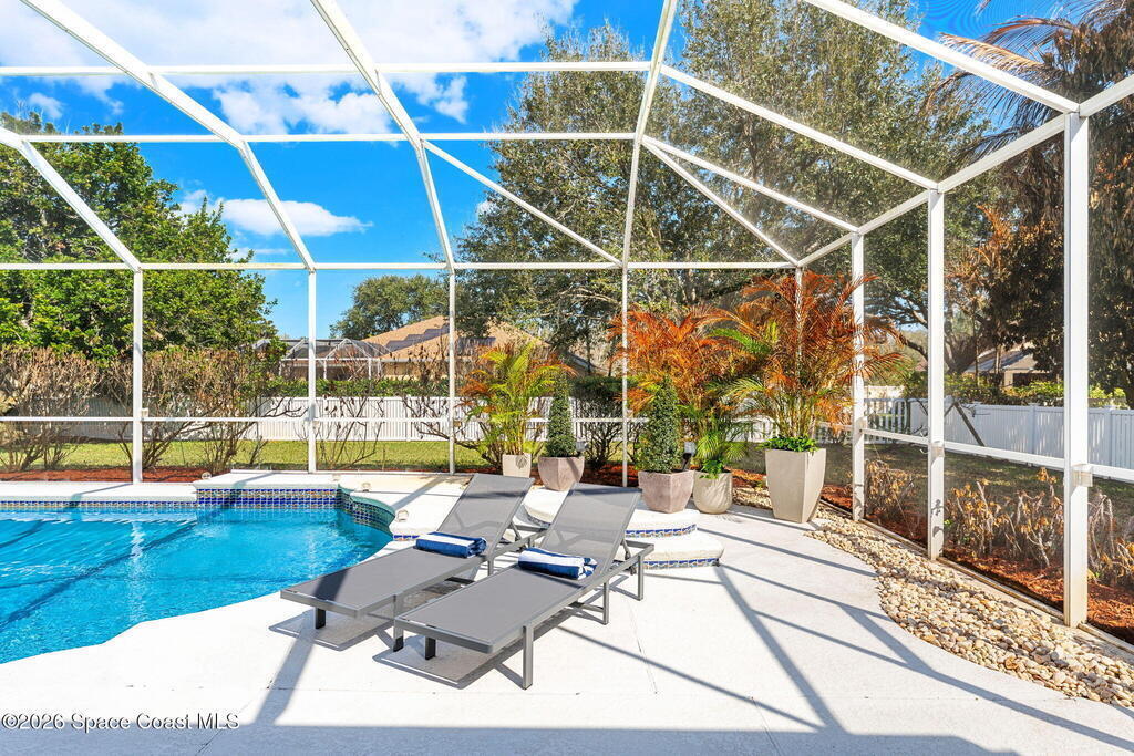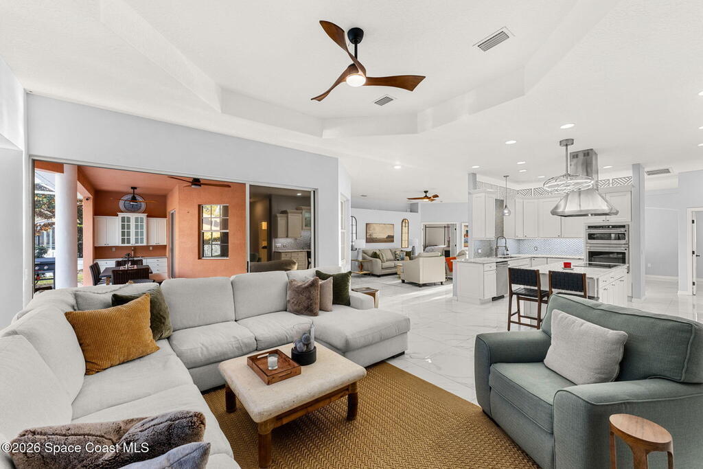 Set on a private 1/2-acre estate between the rivers in South Merritt Island, this light-filled coastal residence offers refined luxury living designed for entertaining & elegance. Arrive via a sweeping circular drive & step into open, sophisticated spaces enhanced by stunning 3' x 3' polished porcelain tile. Featuring 5 bedrooms, 3.5 baths, & spacious upstairs flex room ideal as a 6th bedroom, executive office, or media room. The private primary wing includes an adjoining flex space perfect for a nursery, dressing room, or study. The showstopping chef's kitchen is the heart of the home, appointed with SS appliances, double ovens, double sinks, professional-grade cooktop, an impressive 9-ft island, quartz tops, custom backsplash, Butler's pantry, and maple cabinetry. Outdoor living shines with an oversized screened lanai, summer kitchen, solar-heated pool, outdoor shower, fenced yard & lush fruit trees. Oversized garage, newer roof, & updated systems complete this exceptional offering.