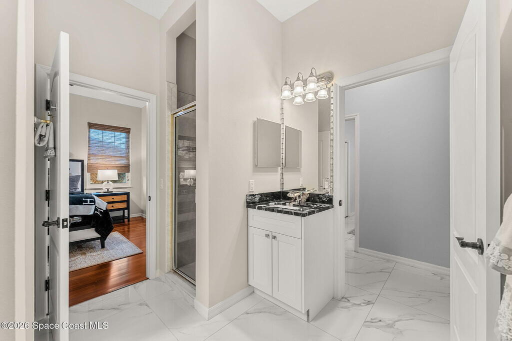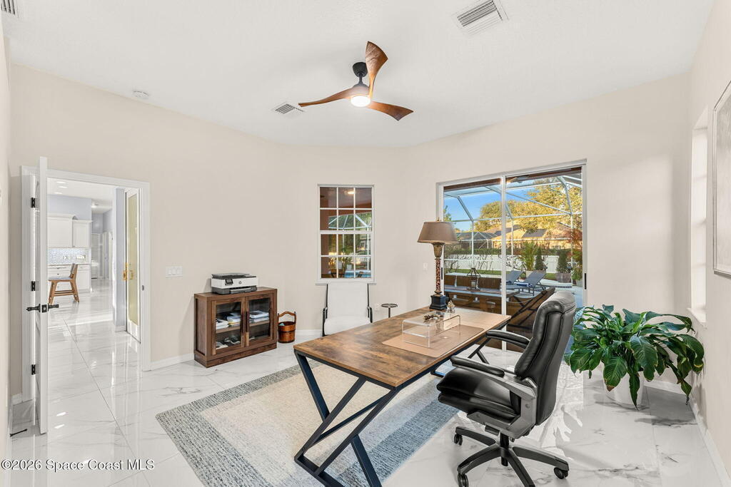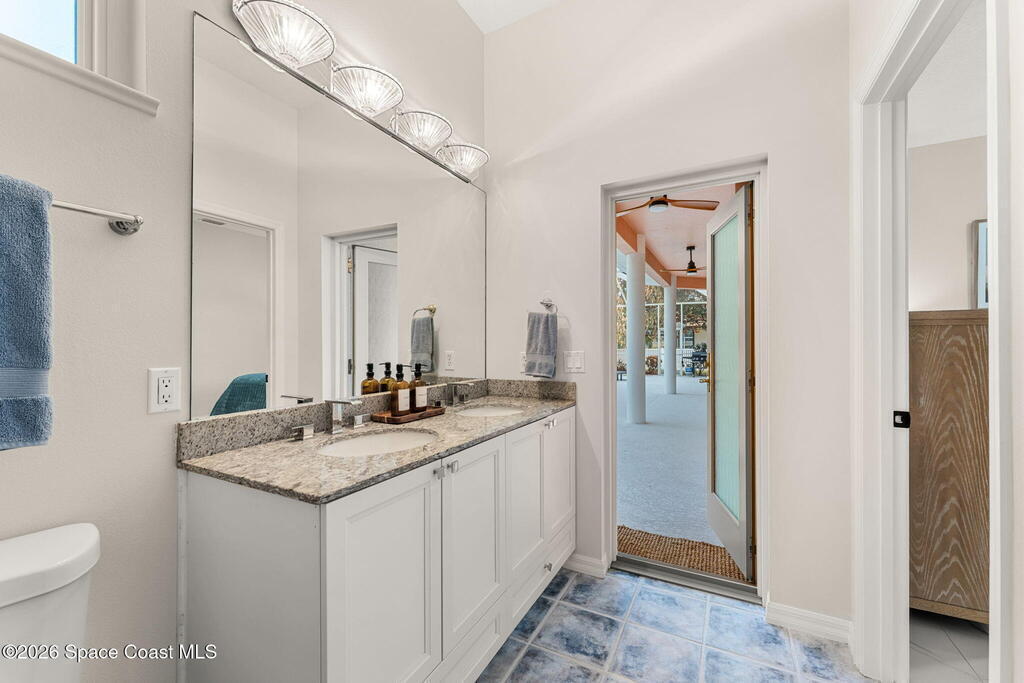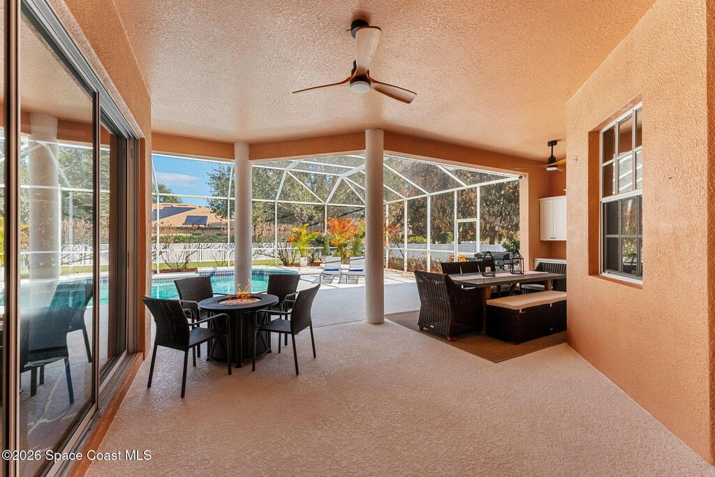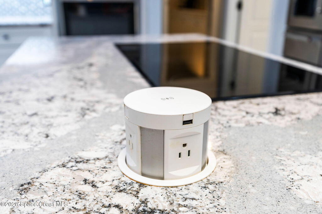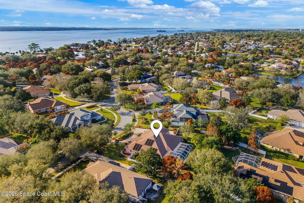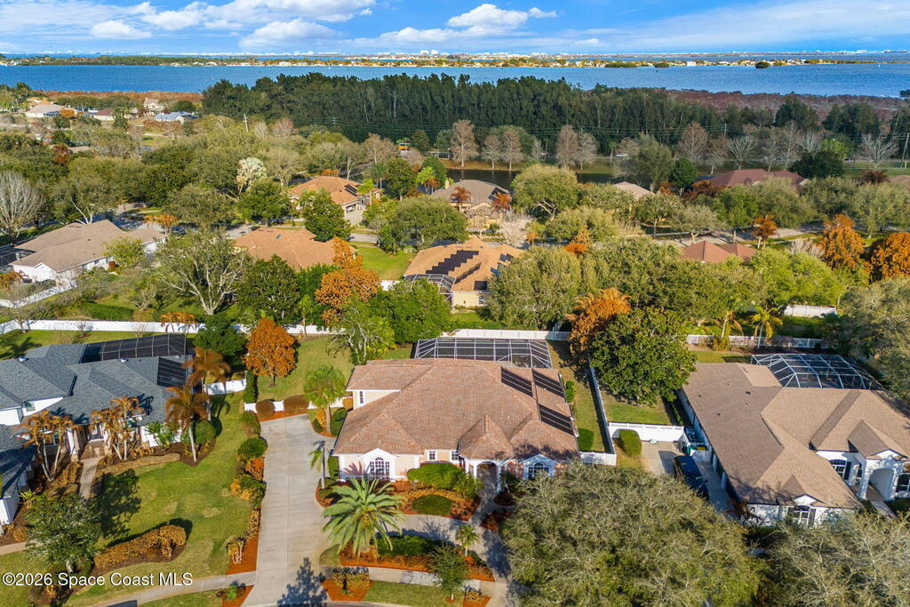 Set on a private 1/2-acre estate between the rivers in South Merritt Island, this light-filled coastal residence offers refined luxury living designed for entertaining & elegance. Arrive via a sweeping circular drive & step into open, sophisticated spaces enhanced by stunning 3' x 3' polished porcelain tile. Featuring 5 bedrooms, 3.5 baths, & spacious upstairs flex room ideal as a 6th bedroom, executive office, or media room. The private primary wing includes an adjoining flex space perfect for a nursery, dressing room, or study. The showstopping chef's kitchen is the heart of the home, appointed with SS appliances, double ovens, double sinks, professional-grade cooktop, an impressive 9-ft island, quartz tops, custom backsplash, Butler's pantry, and maple cabinetry. Outdoor living shines with an oversized screened lanai, summer kitchen, solar-heated pool, outdoor shower, fenced yard & lush fruit trees. Oversized garage, newer roof, & updated systems complete this exceptional offering.