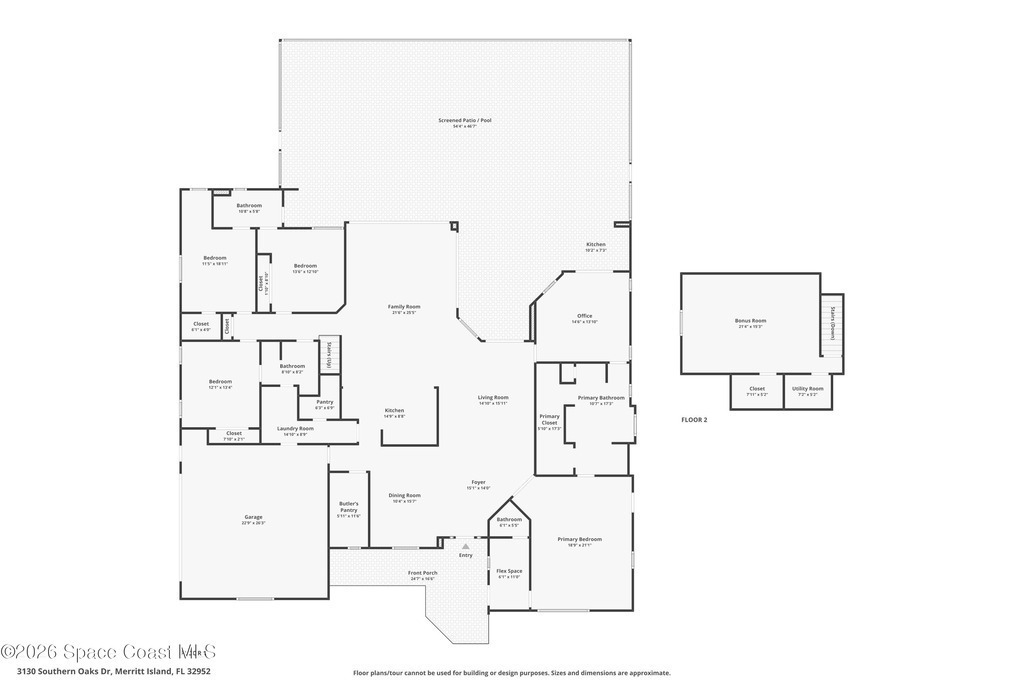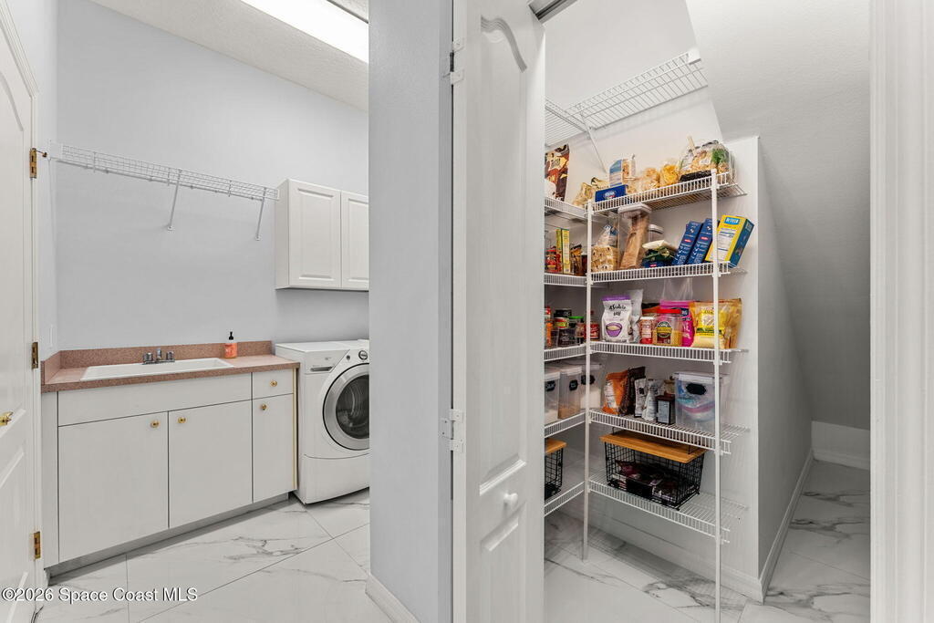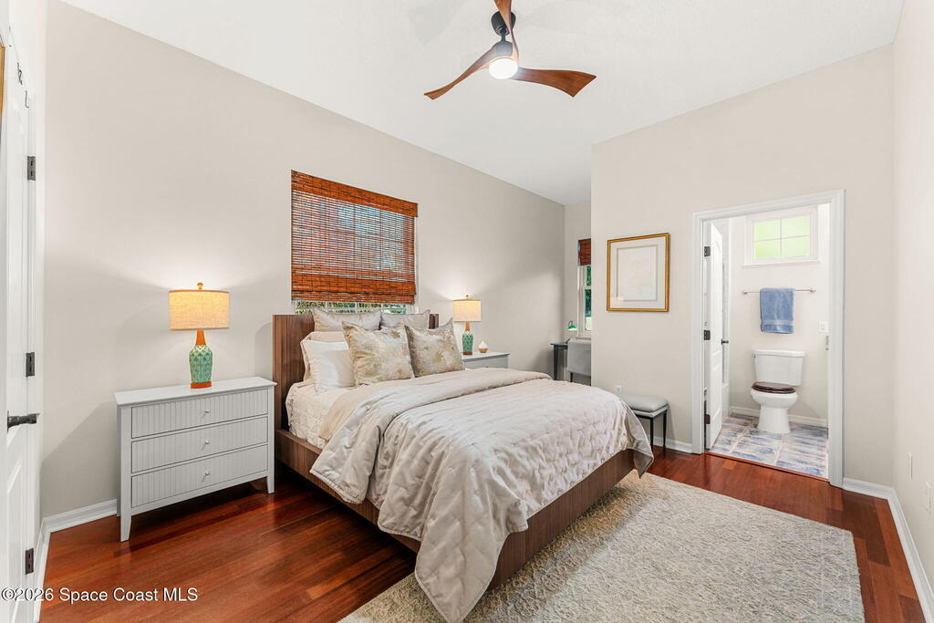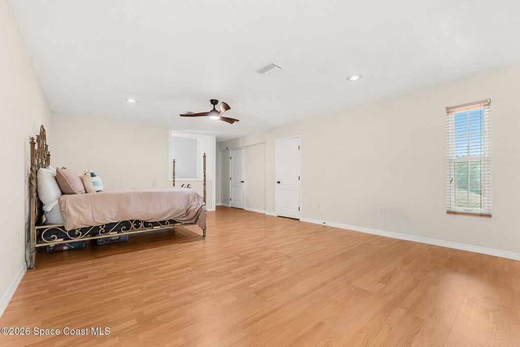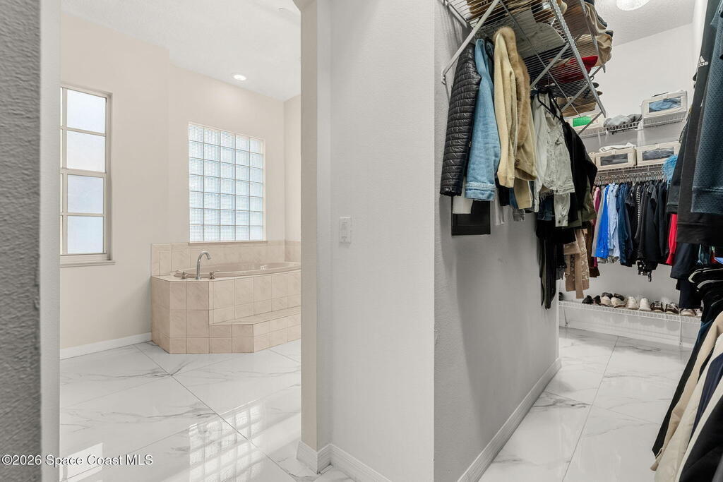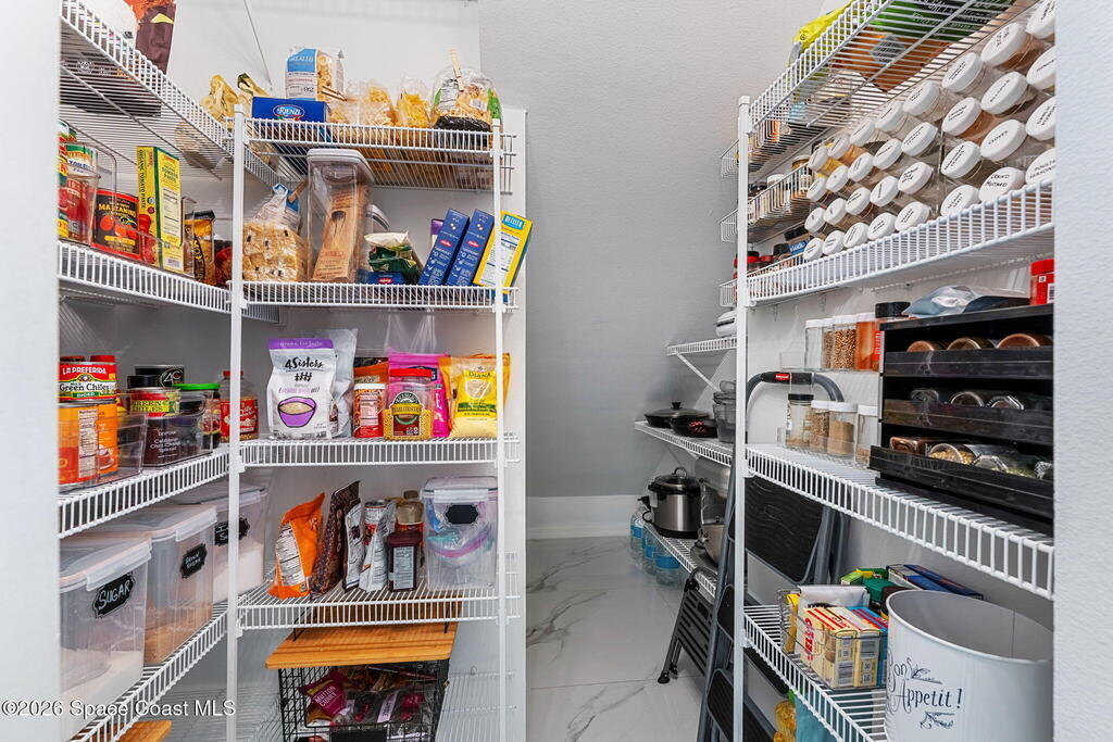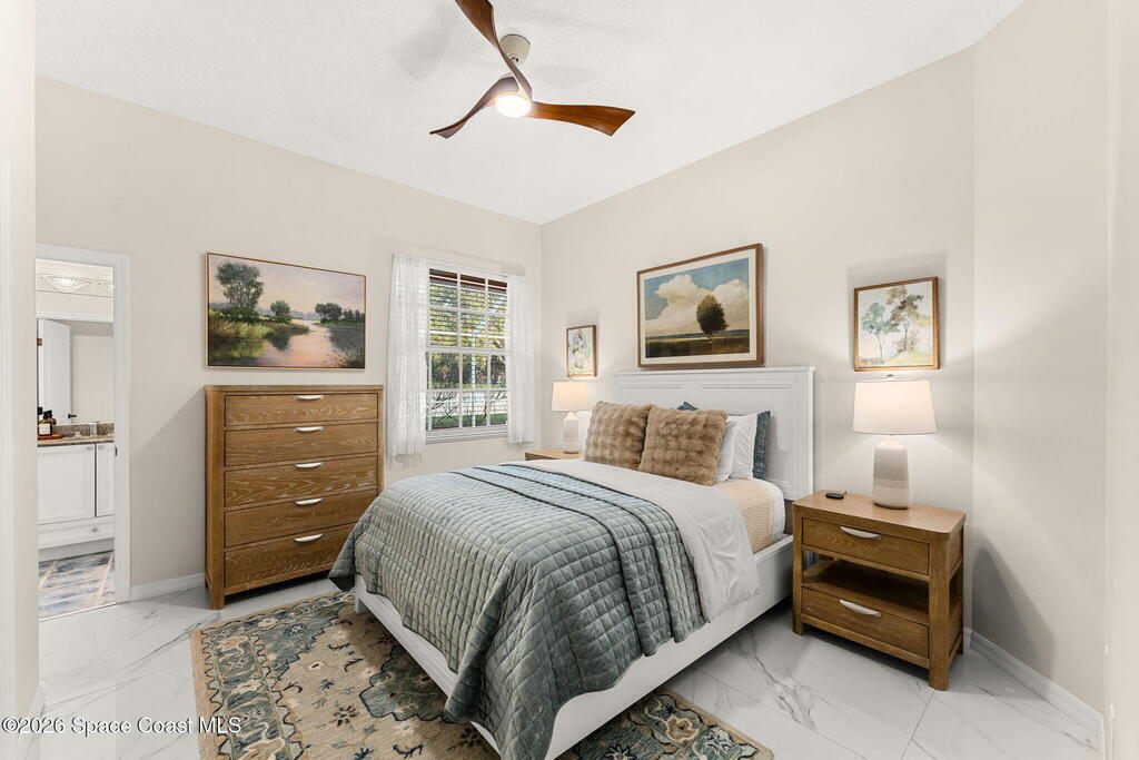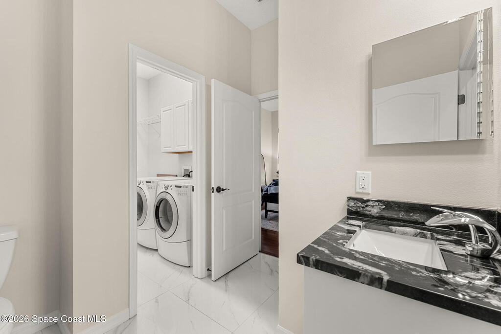Set on a private 1/2-acre estate between the rivers in South Merritt Island, this light-filled coastal residence offers refined luxury living designed for entertaining & elegance. Arrive via a sweeping circular drive & step into open, sophisticated spaces enhanced by stunning 3' x 3' polished porcelain tile. Featuring 5 bedrooms, 3.5 baths, & spacious upstairs flex room ideal as a 6th bedroom, executive office, or media room. The private primary wing includes an adjoining flex space perfect for a nursery, dressing room, or study. The showstopping chef's kitchen is the heart of the home, appointed with SS appliances, double ovens, double sinks, professional-grade cooktop, an impressive 9-ft island, quartz tops, custom backsplash, Butler's pantry, and maple cabinetry. Outdoor living shines with an oversized screened lanai, summer kitchen, solar-heated pool, outdoor shower, fenced yard & lush fruit trees. Oversized garage, newer roof, & updated systems complete this exceptional offering.