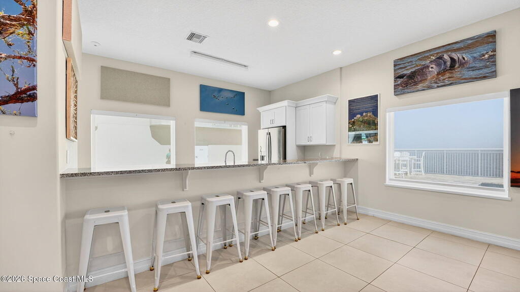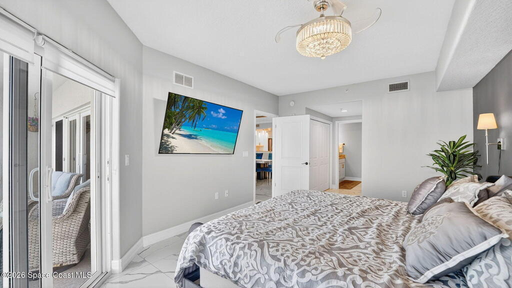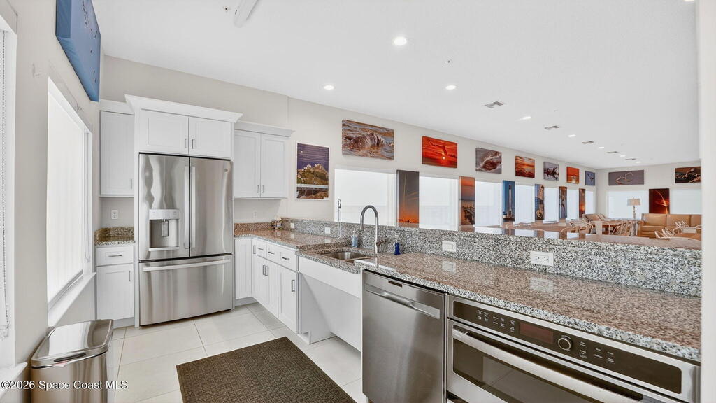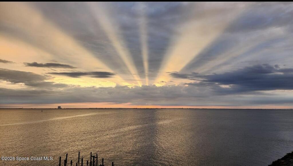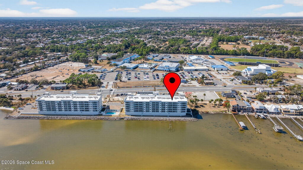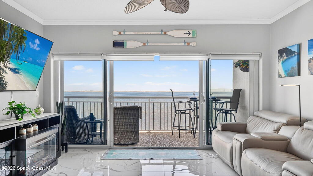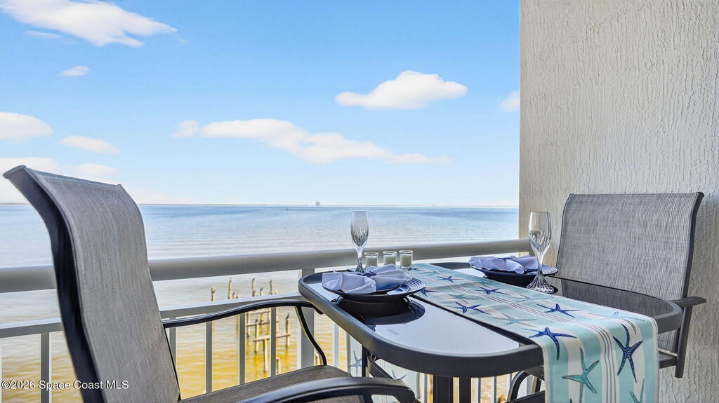 Built in 2023 & offering the 2nd Largest Floor Plan in River Palms, this Waterfront Condo delivers iconic Space Coast Views. Enjoy Impact Windows & a Private Balcony overlooking the Indian River & Kennedy Space Center for front row seats to Rocket Launches from the Living Room or the Primary. Inside, oversized Porcelain Tile runs throughout, paired w/ Granite Counters in the Kitchen & Baths. The Kitchen shines w/ SS Appliances, an Upgraded Double Oven, Farmhouse Sink, & Classic Subway Tile. A dedicated Laundry Room includes a Smart Front Load Washer/Dryer + Pedestals & Utility Sink. The Living & Dining areas are enhanced w/ Crown Molding. The Primary Suite features a Walk-in Closet & En Suite w/ Dual Sinks. Spot Manatees, Dolphins & Stingrays daily! Resort Style Amenities include a Waterfront Heated Pool, Clubhouse, Fitness Center, & Garage Parking. Maintenance Fee includes Water, Sewer, Trash, Internet & Cable. Minutes to Beaches, Dining, Shopping & SR 528.
