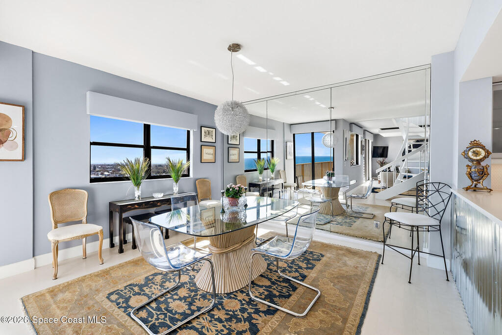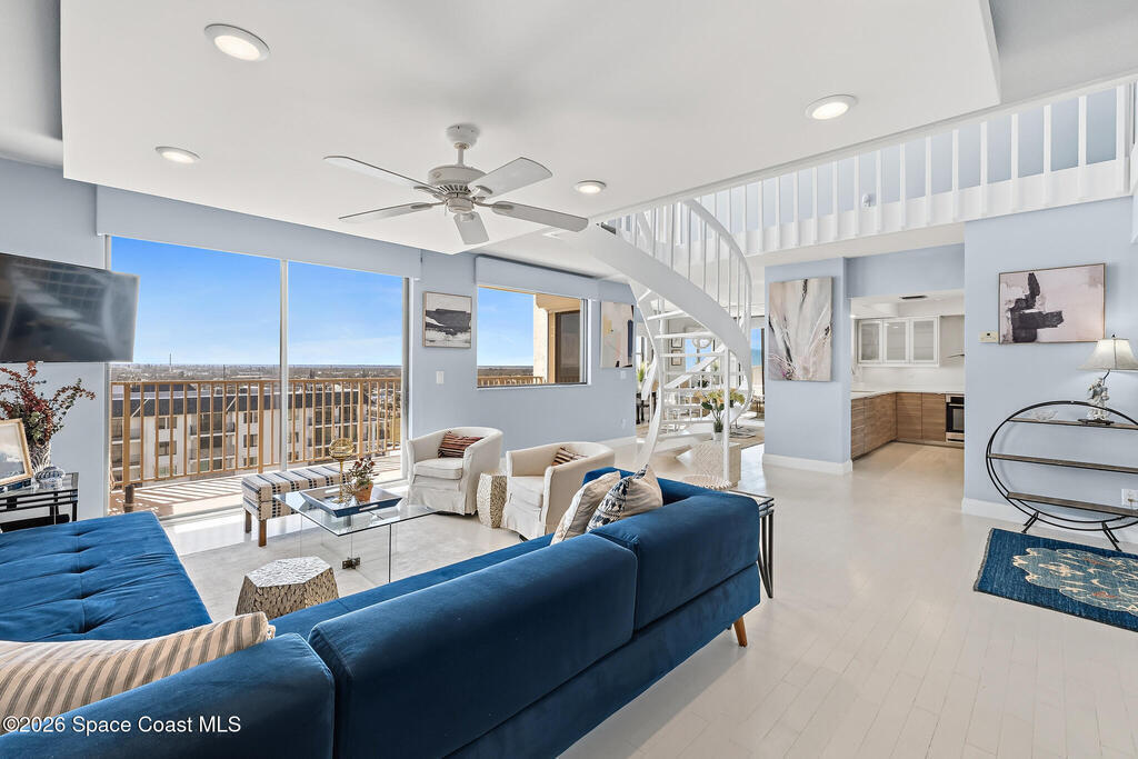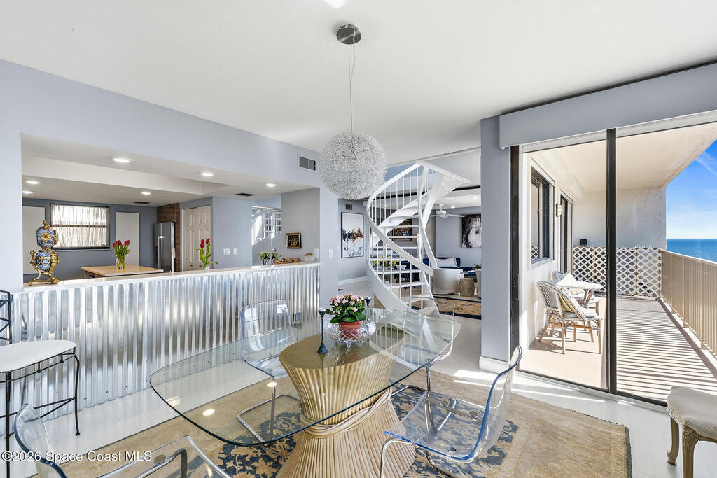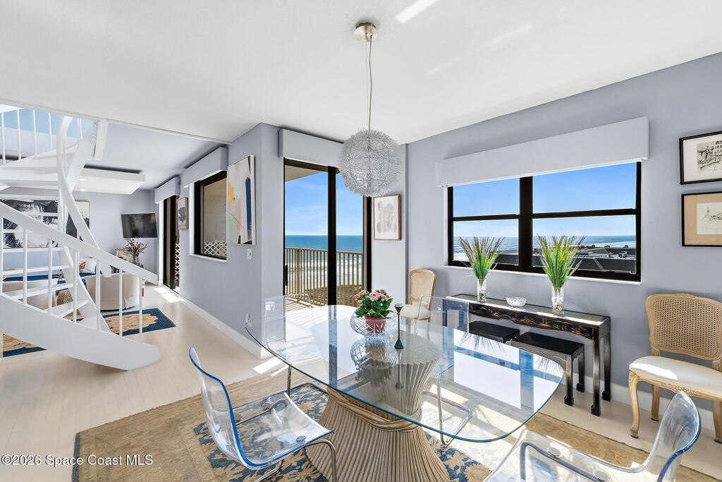 Exceptional TWO-STORY, FULLY-FURNISHED 2 bed, 2.5 bath OCEANFRONT condo on the 10th floor with breathtaking OCEAN VIEWS FROM TWO BALCONIES! Over 1,900 sqft of refined elegance featuring a modern chef's kitchen with white ceramic glass electric cooktop, high-gloss quartz counters, spacious island, pantry, and cabinetry-flush stainless steel appliances. The open-concept living area impresses with a dramatic spiral staircase, sleek wood-tile flooring throughout, and direct balcony access showcasing sweeping ocean views. The generous primary suite offers his & hers closets, plush carpeting, en suite bath with dual marble sinks, and subway-tile shower. The guest suite also features a private en suite bath and balcony patio access. A versatile flex nook includes built-in desk and bistro bar. An upstairs laundry room provides convenience. Electric shutters, a private garage, and hurricane-rated windows and sliders add piece of mind. This is coastal luxury living redefined- a true MUST SEE!