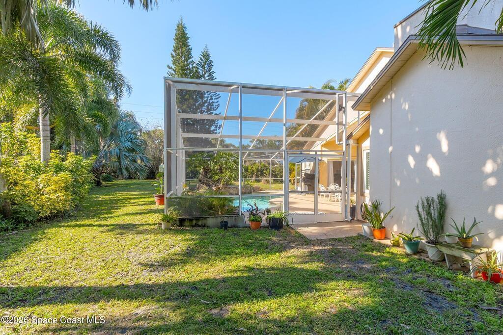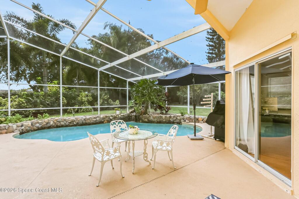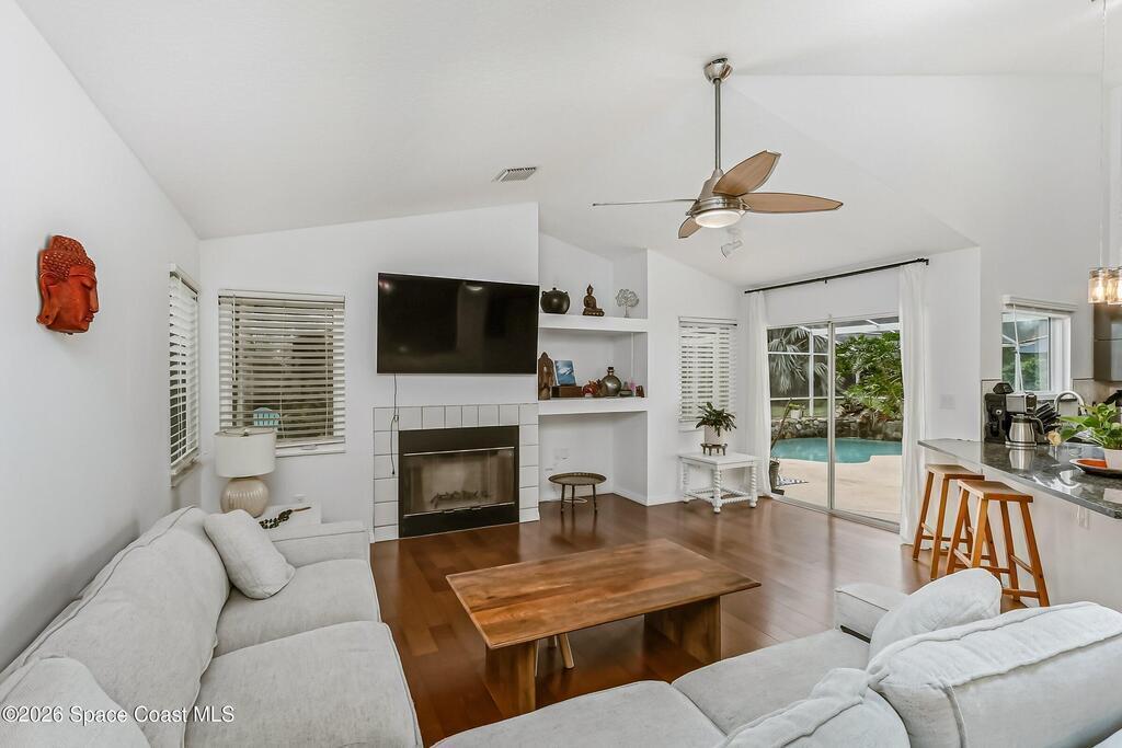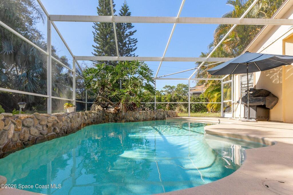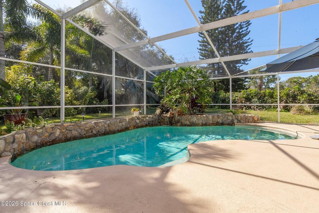 Step into your private oasis. This 3-bedroom, 2 bathroom split-plan home seamlessly blends indoor living with a spectacular tropical backyard. Upon entry, you are greeted by the formal living & dining rooms featuring vaulted ceilings, creating an airy, atmosphere perfect for entertaining. The heart of the home is the bright, open kitchen, featuring SS appliances, ample prep space, & breakfast bar all overlooking the family room. Retreat to the private primary ensuite, boasting his-and-her walk-in closets, a tub, and a separate walk-in shower. Through sliding glass doors lies your ultimate outdoor entertaining area. The sparkling, screened-in pool is accented by a rock waterfall, offering a serene soundscape for relaxing evenings. The fenced backyard ensures maximum privacy. Roof (2021), HVAC (2023), interior paint & numerous other updates, this home is turnkey. Perfectly situated, you are just minutes from shopping, dining, EFSC, and the recreational amenities of Wickham Park.