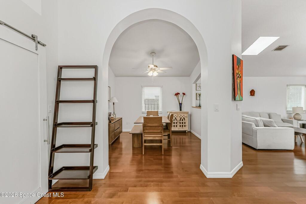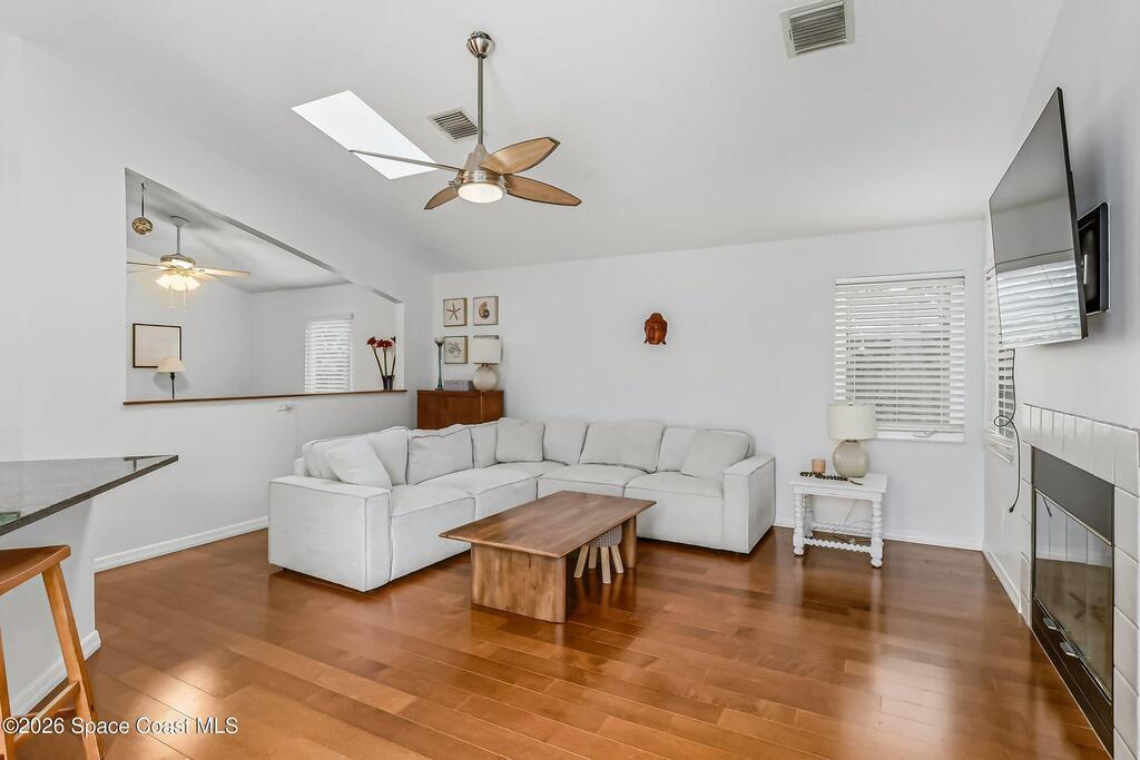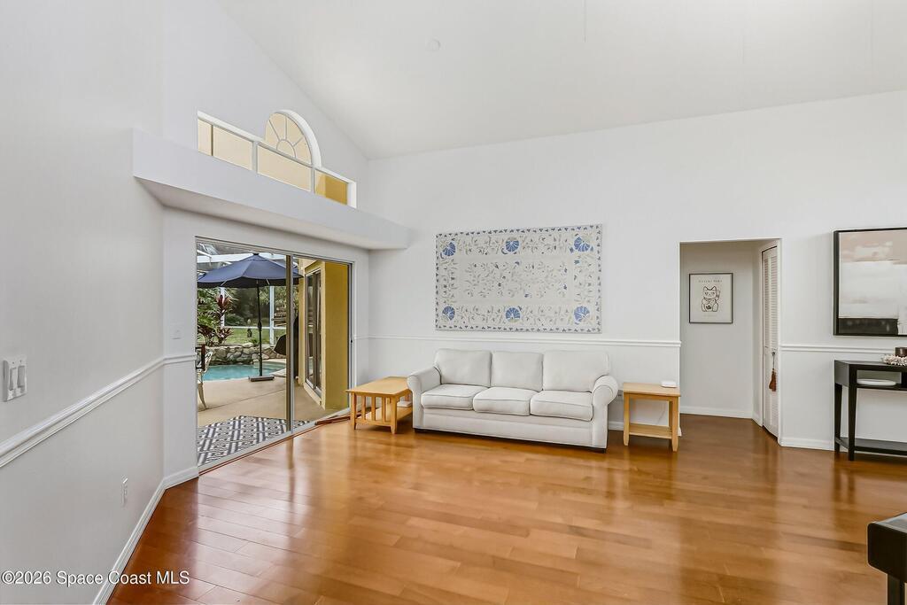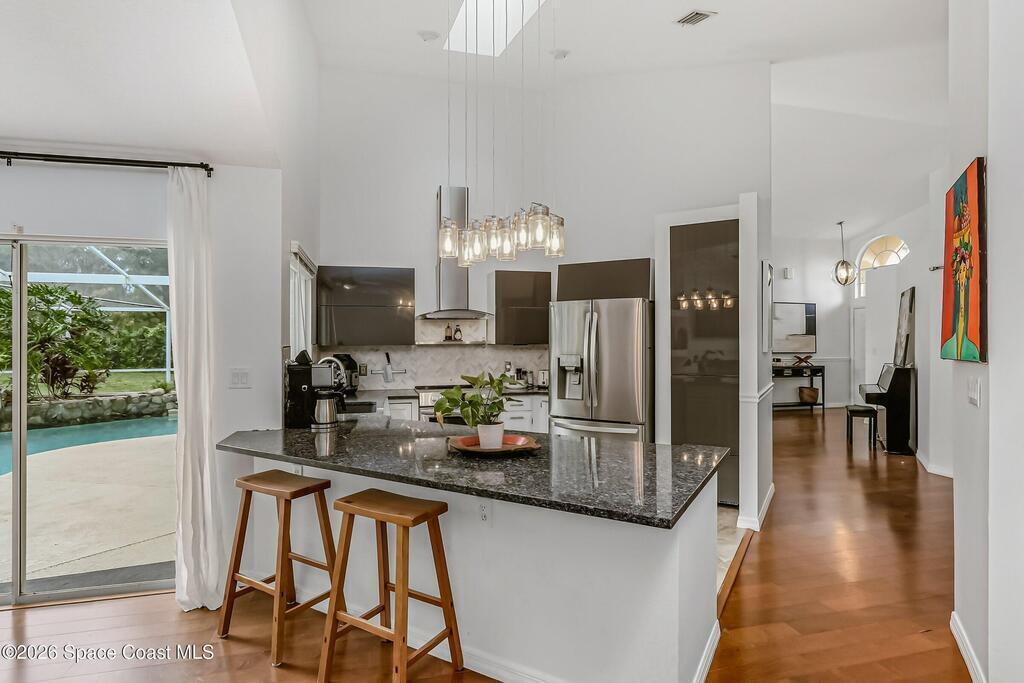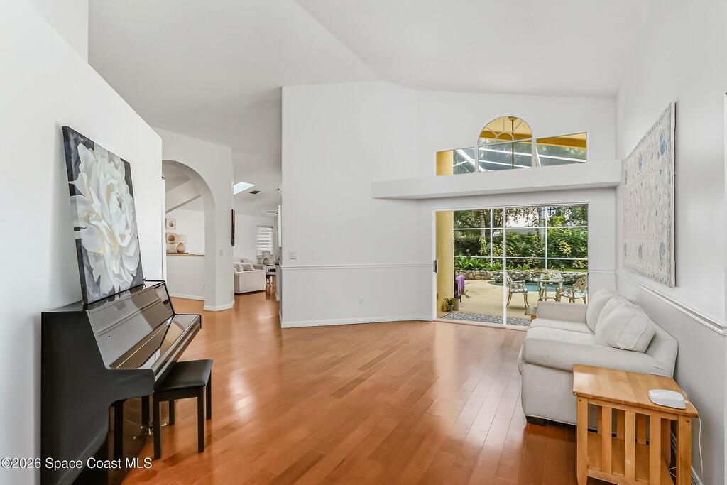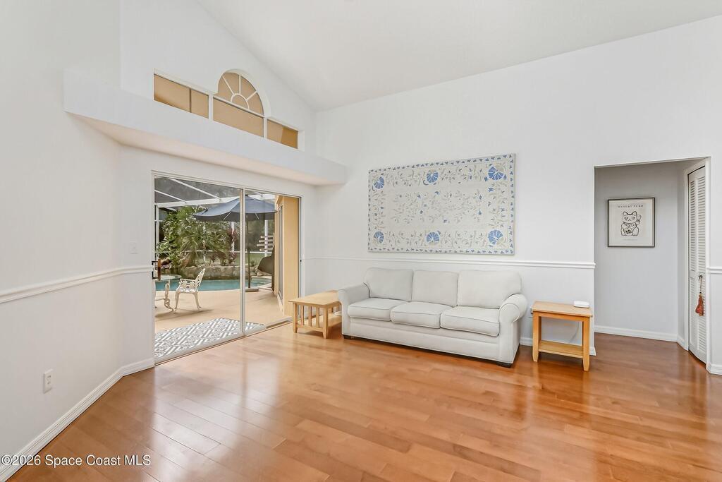 Step into your private oasis. This 3-bedroom, 2 bathroom split-plan home seamlessly blends indoor living with a spectacular tropical backyard. Upon entry, you are greeted by the formal living & dining rooms featuring vaulted ceilings, creating an airy, atmosphere perfect for entertaining. The heart of the home is the bright, open kitchen, featuring SS appliances, ample prep space, & breakfast bar all overlooking the family room. Retreat to the private primary ensuite, boasting his-and-her walk-in closets, a tub, and a separate walk-in shower. Through sliding glass doors lies your ultimate outdoor entertaining area. The sparkling, screened-in pool is accented by a rock waterfall, offering a serene soundscape for relaxing evenings. The fenced backyard ensures maximum privacy. Roof (2021), HVAC (2023), interior paint & numerous other updates, this home is turnkey. Perfectly situated, you are just minutes from shopping, dining, EFSC, and the recreational amenities of Wickham Park.
