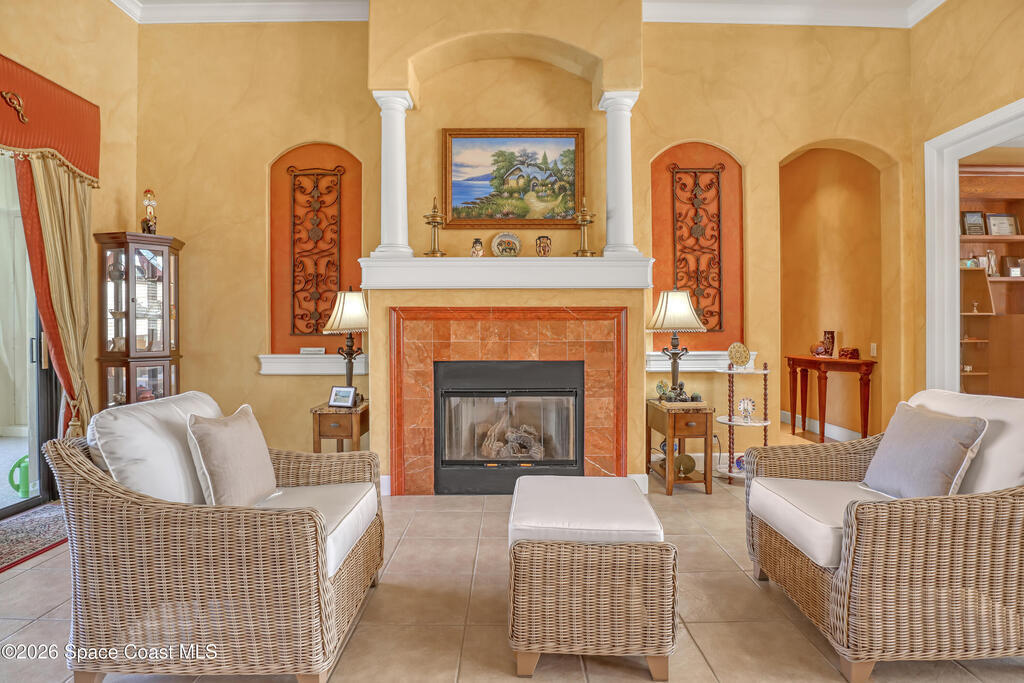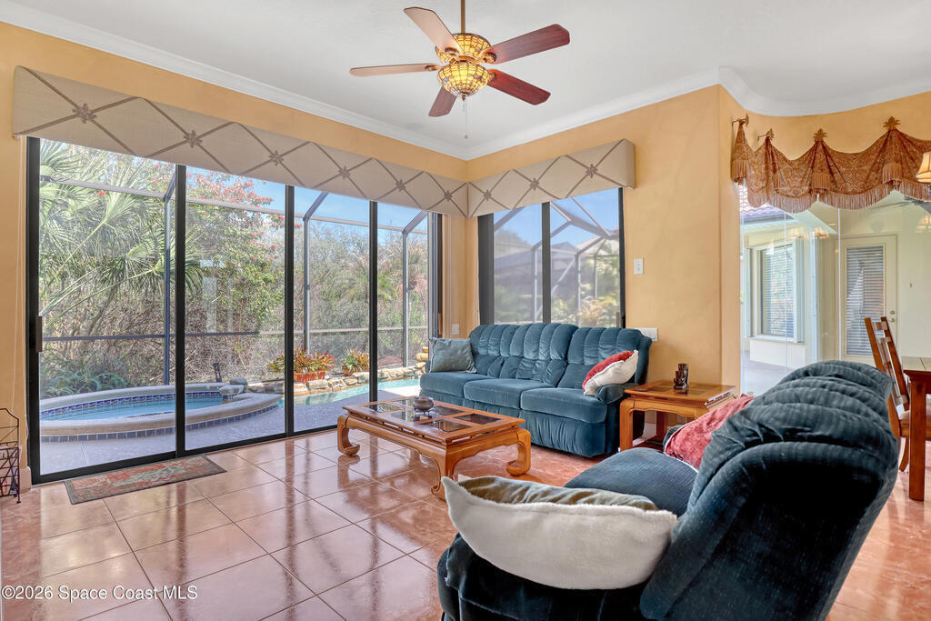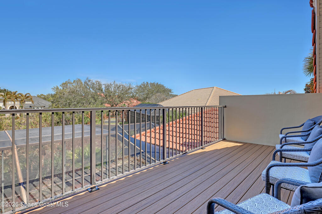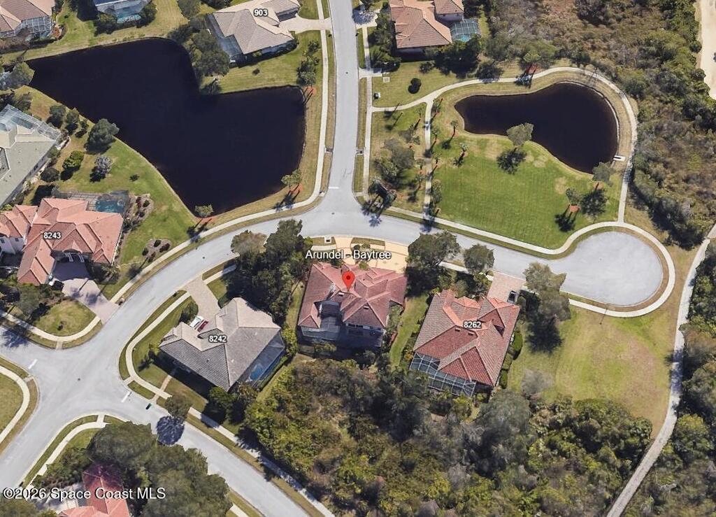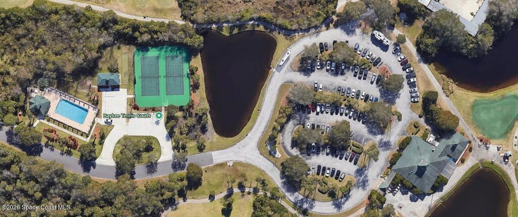 Beautiful two-story home located in the desirable Baytree community. This spacious 4-bedroom, 4.5-bath residence also includes a dedicated office and a 3-car garage, offering plenty of room for work, play, and storage. Nice circular driveway.The open floor plan is highlighted by expansive infinity windows and sliders that frame the screened-in lanai and pool with waterfall feature. A large kitchen with center island and granite countertops overlooks the family room, creating an ideal space for entertaining. The home also features formal living with gas fireplace and dining room with wet bar area for more traditional gatherings.The second floor includes a generous game/media loft, along with two bedrooms and two full baths. Step outside onto the upper deck to enjoy north-facing views perfect for watching Space Shuttle launches.Baytree offers community amenities, including tennis/ pickleball courts, a community pool, and a playground.