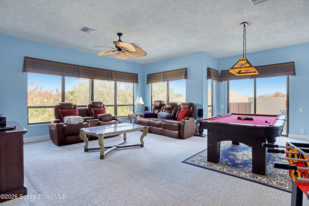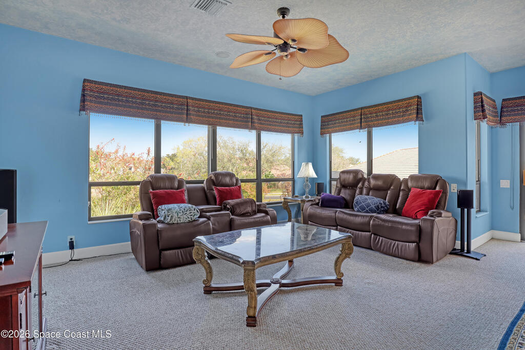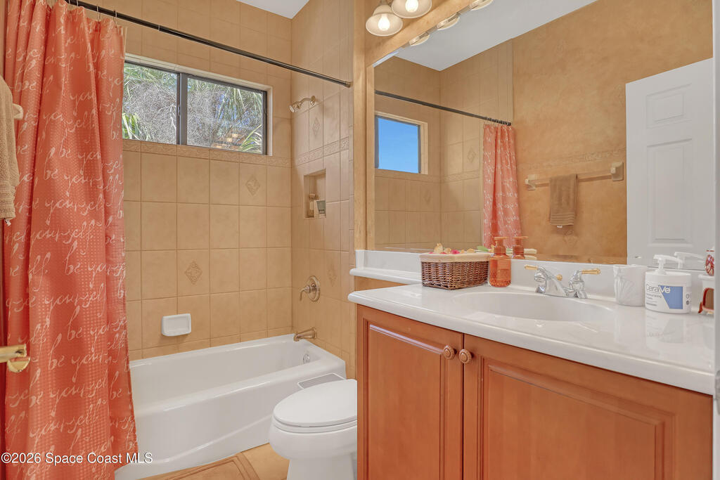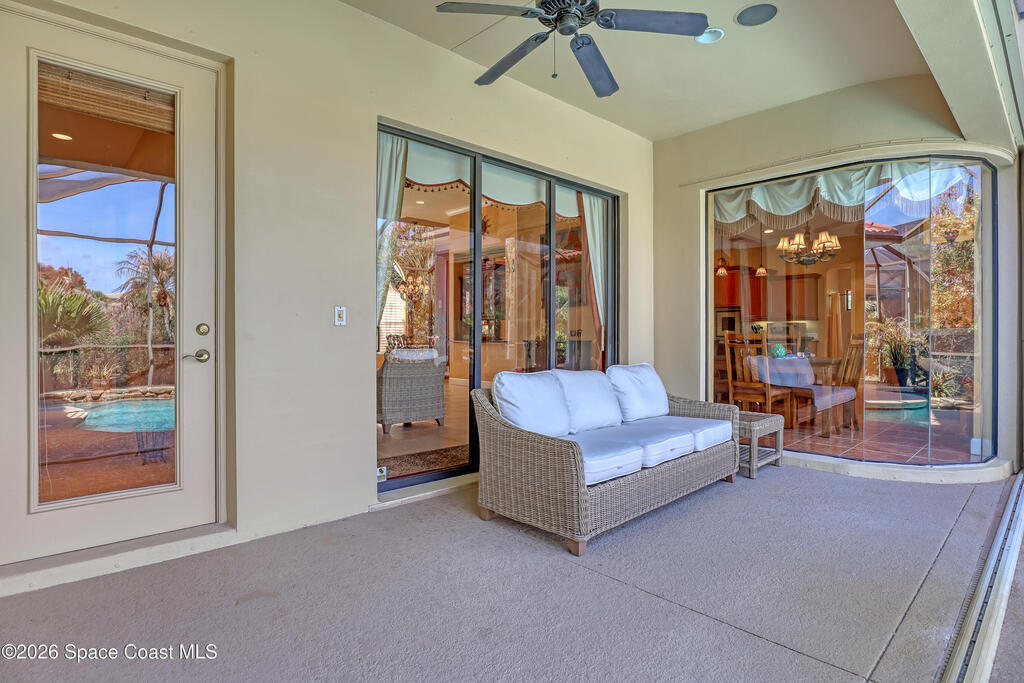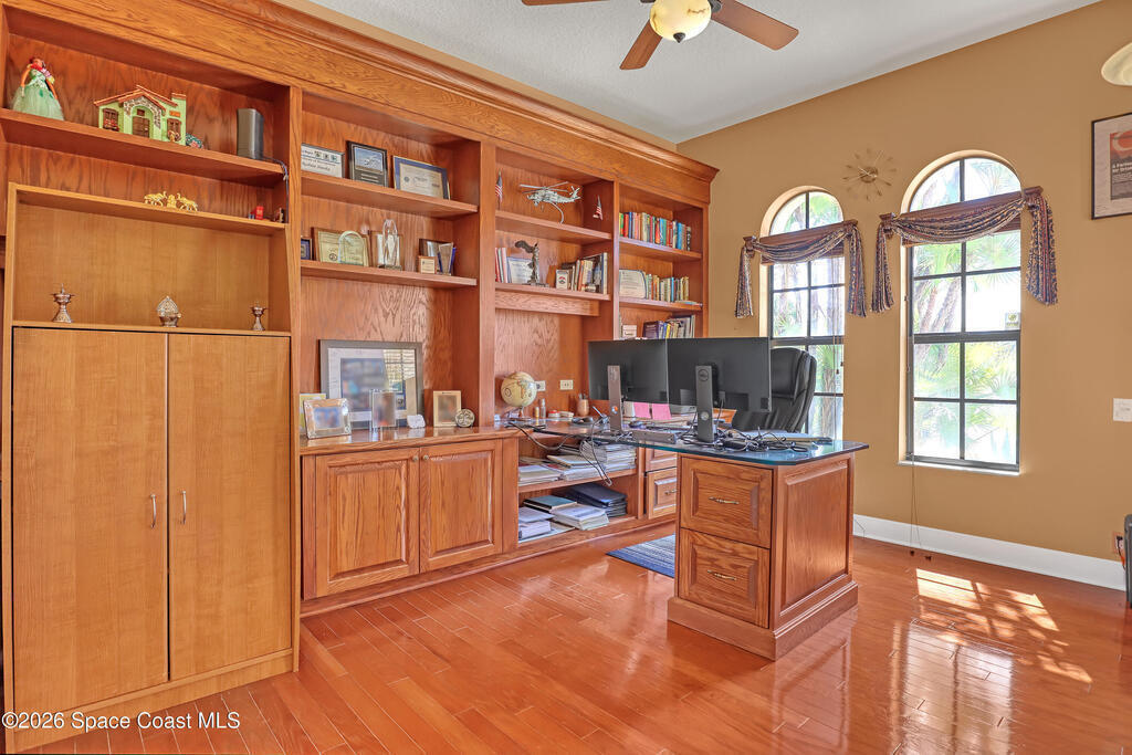 Beautiful two-story home located in the desirable Baytree community. This spacious 4-bedroom, 4.5-bath residence also includes a dedicated office and a 3-car garage, offering plenty of room for work, play, and storage. Nice circular driveway.The open floor plan is highlighted by expansive infinity windows and sliders that frame the screened-in lanai and pool with waterfall feature. A large kitchen with center island and granite countertops overlooks the family room, creating an ideal space for entertaining. The home also features formal living with gas fireplace and dining room with wet bar area for more traditional gatherings.The second floor includes a generous game/media loft, along with two bedrooms and two full baths. Step outside onto the upper deck to enjoy north-facing views perfect for watching Space Shuttle launches.Baytree offers community amenities, including tennis/ pickleball courts, a community pool, and a playground.