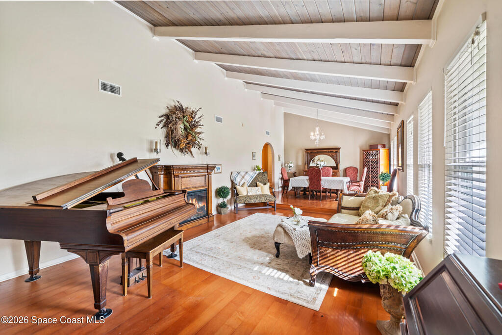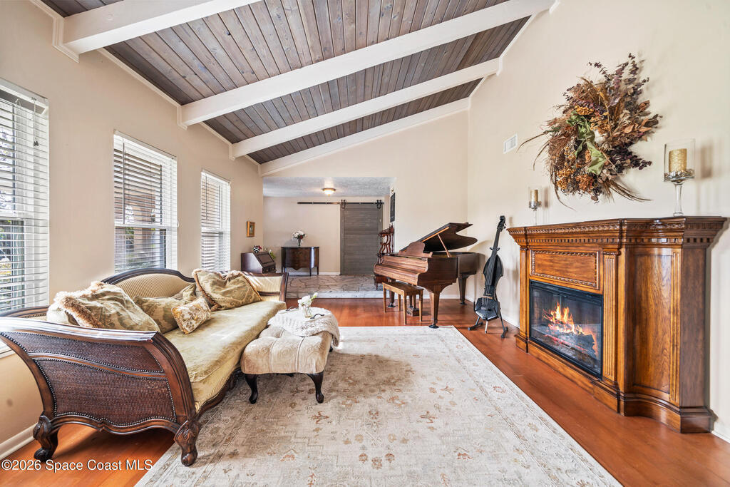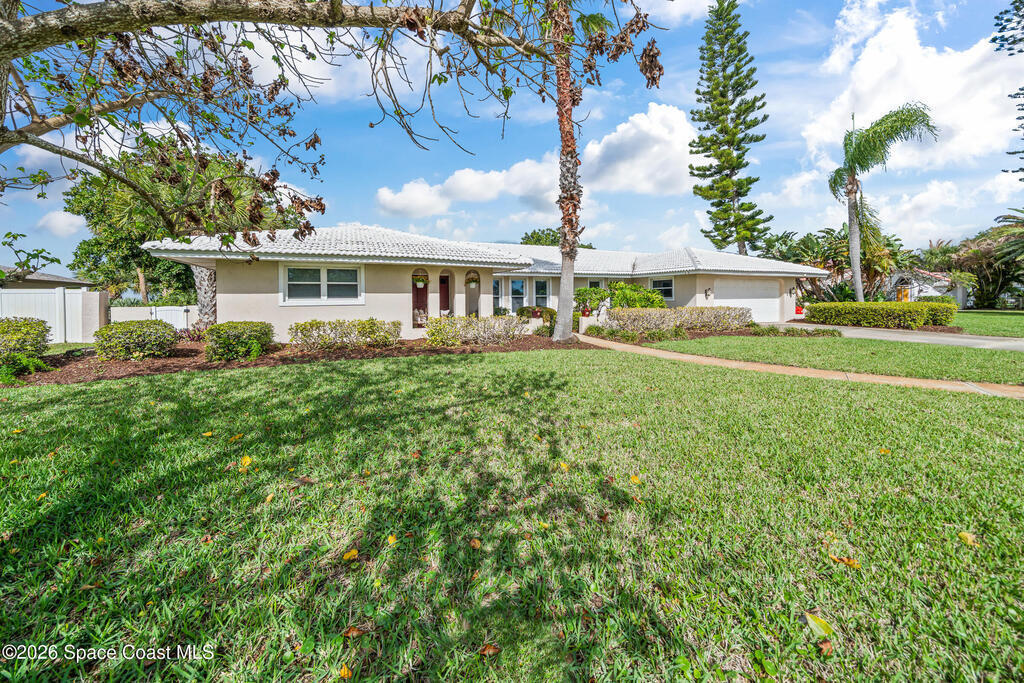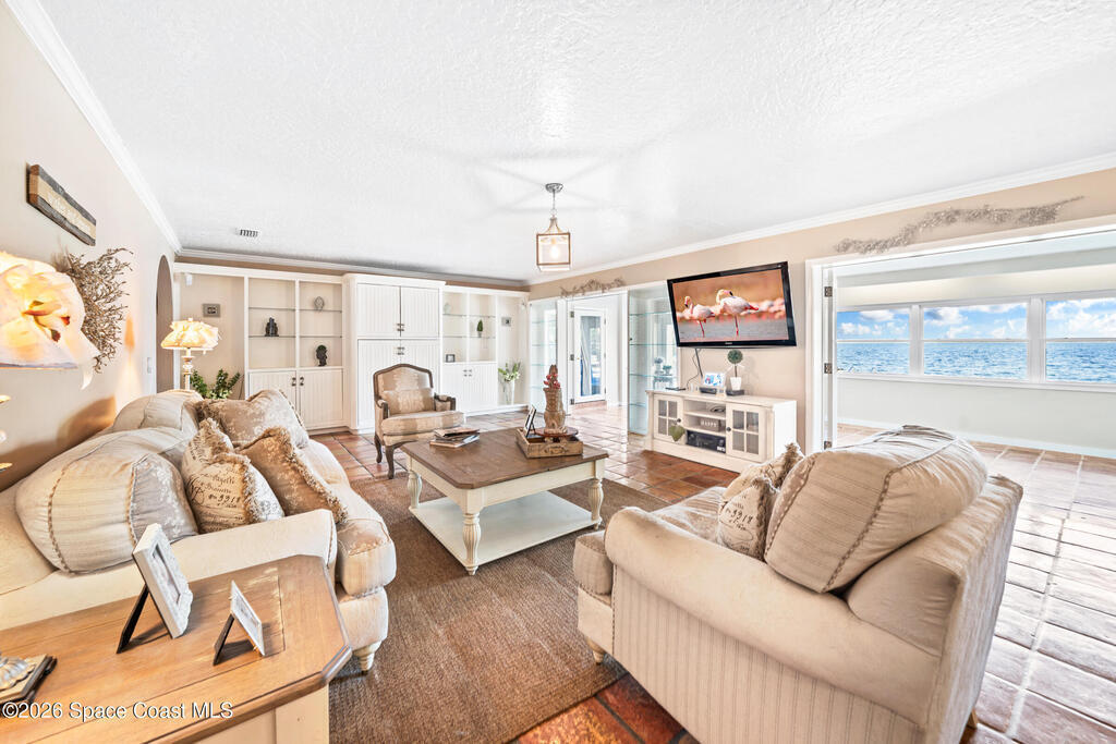 Enjoy direct, unobstructed riverfront living in Indialantic on a rare .46-acre lot with spectacular north, south, and west views. Ideally located between the Melbourne and Eau Gallie Causeways, this property offers breathtaking sunsets and panoramic water views. The home features a split floor plan, vaulted wood-beam ceilings in the living room, and an elegant marble-style entry with a wood barn door separating the bedroom wing. The primary suite and guest bedroom open to a glass-enclosed porch with Spanish tile flooring leading to a large Olympic-style pool overlooking the river. Recent updates include hurricane impact windows and doors, tile reroof partial (2019), seawall (2016), water heater (2022), HVAC (2016), and a new pool pump. The kitchen features white shaker cabinetry, granite countertops, and an eat-in bar with views of the pool and river. Located just half a mile from the beach with easy access to dining, shopping, A-rated schools, golf, and Orlando attractions.
