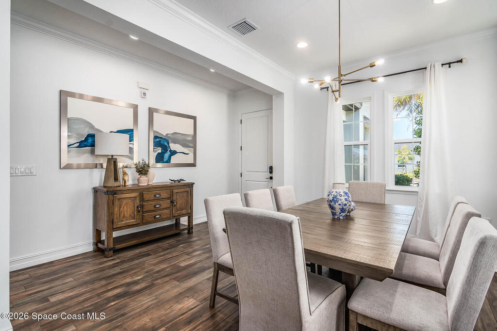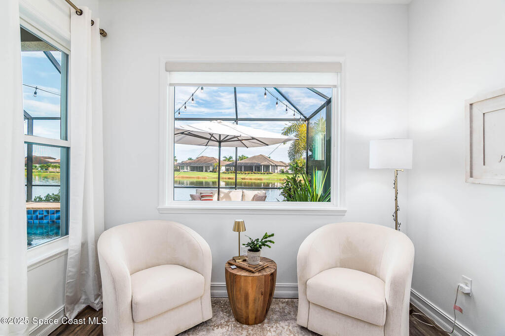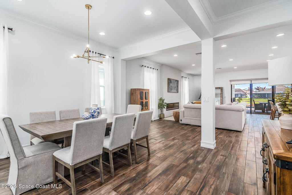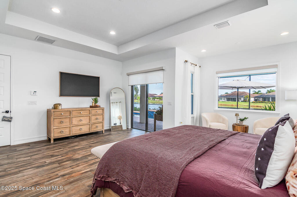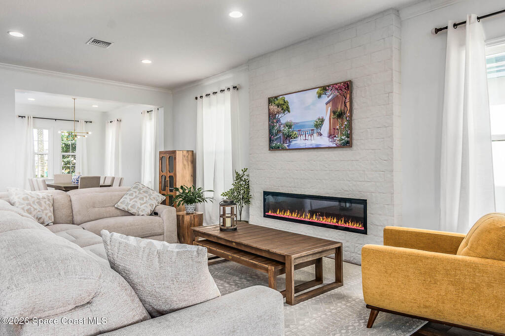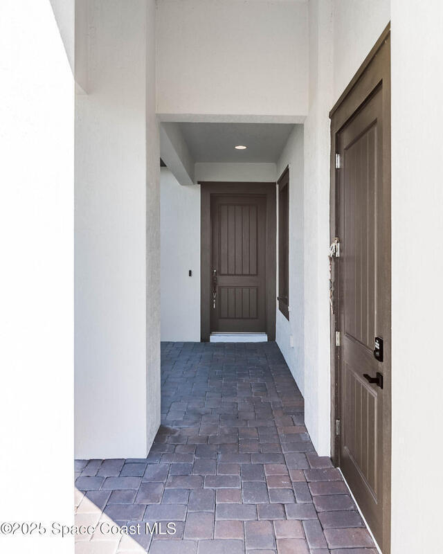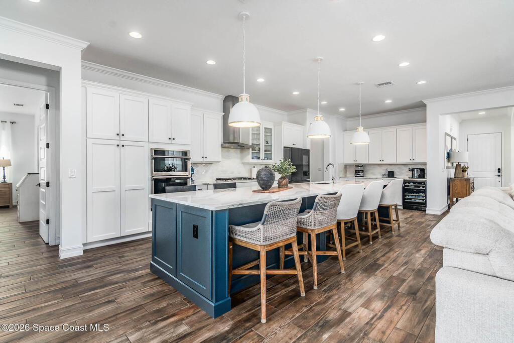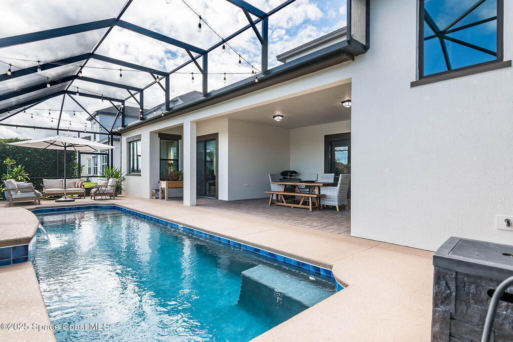 Perfectly nestled on a serene lakefront lot in Viera, Melbourne 32940, this exceptional residence showcases a stunning outdoor setting w/ a waterfall pool & expansive lanai designed for entertaining or quiet relaxation. Wood look tile underscores the ground floor. The great room features a beautiful fireplace, creating a warm yet elegant gathering space. The gourmet kitchen blends beauty & function w/ wall ovens, gas cooktop, vent hood, wine fridge & a remarkable 14' island w/ Calacatta quartz counters & pendant lighting--ideal for hosting & everyday living. Designed for comfort & privacy, it offers 4 bdrms (3 w/ private baths) 4.5 ba + large upstairs bonus room, 8 ft doors, water softener, a 2.5-car garage & convenient drop zone for UPS packages. Smart Home w/ Google Assist, Leviton light switches & nest Doorbell. The owners' ste provides a dedicated sitting area, oversized walk-in closet, dual showers & sinks. A+ schools near top dining, golf & shopping & just 15 min from the beach.