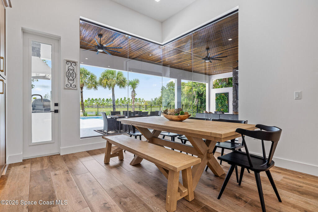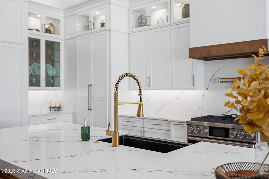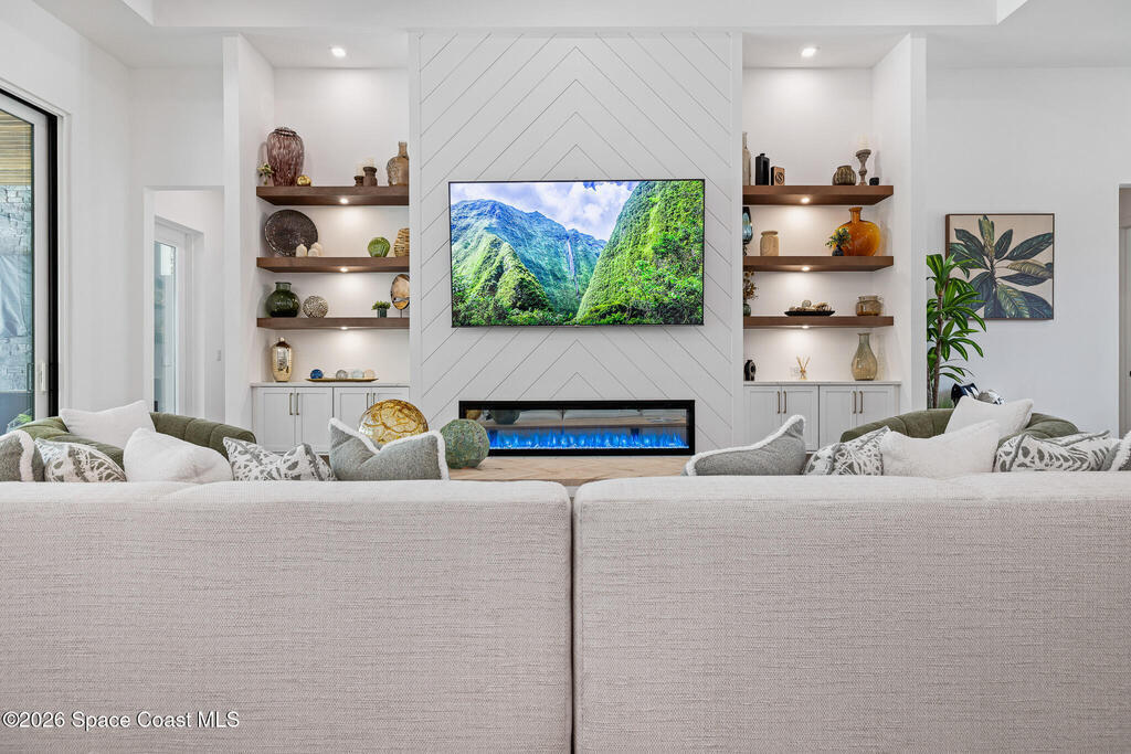 Elegant Custom Built Brand New 5 Bed, 3.5 Bath, 3 Car Home featuring an open floor plan, home office, ensuite, 10' tall sliding glass doors, Impact glass windows, Plantation shutters, large kitchen island, built in appliances, wine fridge, walk in pantry, laundry room with wall to wall storage, central vaccum system, air conditioned garage, whole home generator prewire, indoor electric fireplace, breakfast nook, summer kitchen, pool, gas buring fireplace w/ TV above on rear patio, heated inground spa, fenced rear yard overlooking a large body of water.