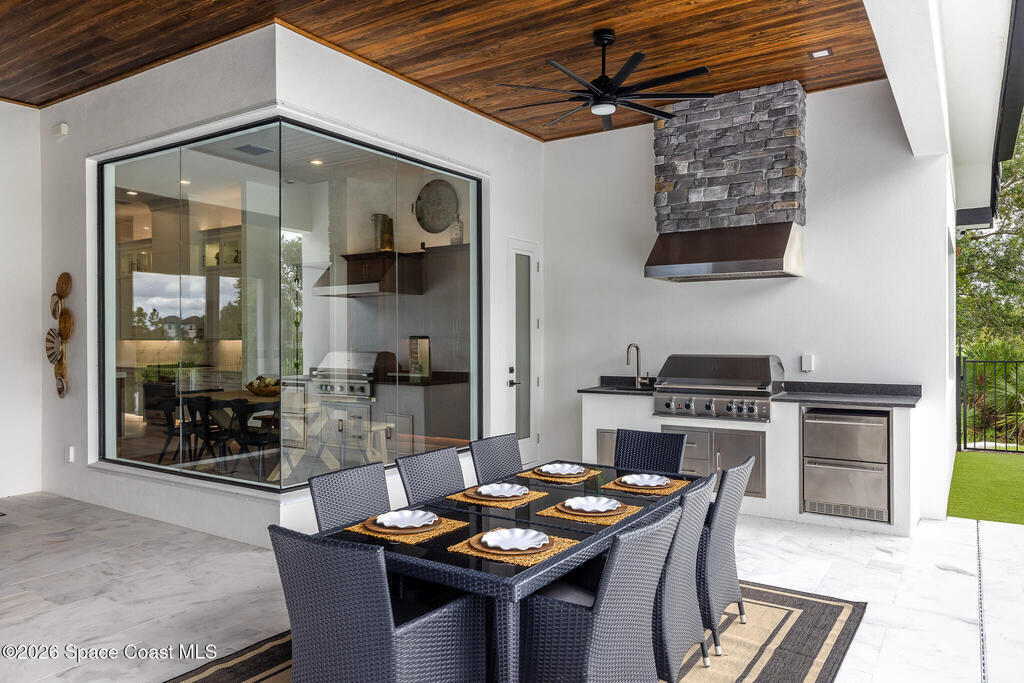 - Exterior FeaturesImpact Windows, Outdoor Kitchen and Storm Shutters