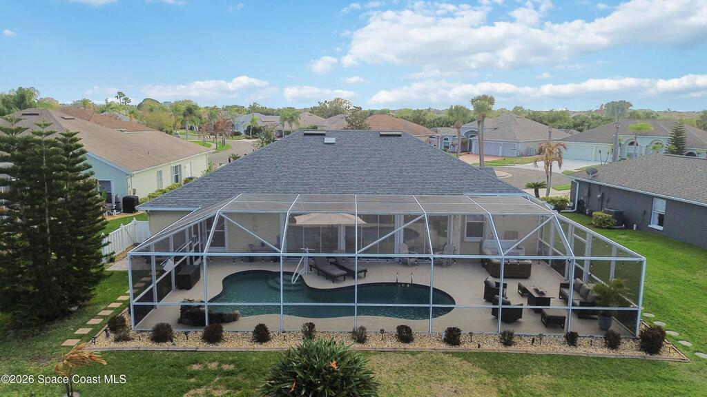 Viera East Golf Course Pool Home! This 4-bedroom, 3-bath, 2,297 sq ft home sits on the 9th fairway with golf and water views. Enjoy a heated saltwater pool with stone waterfall, screened lanai, above-ground hot tub, and enclosed Florida room with sliding glass doors for year-round comfort. Inside, the open floorplan features tile flooring, high ceilings, fireplace with built-ins, and a chef's kitchen with granite countertops, wood cabinetry, stainless steel all-gas appliances, breakfast bar, and dining nook. The primary suite boasts vaulted ceilings, dual closets, spa-style bath, and patio access. Additional upgrades include a tankless water heater, whole-home generator, split-bedroom layout, central vacuum system, and hurricane-proof windows throughout, including the garage.