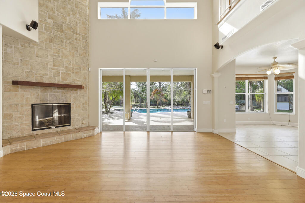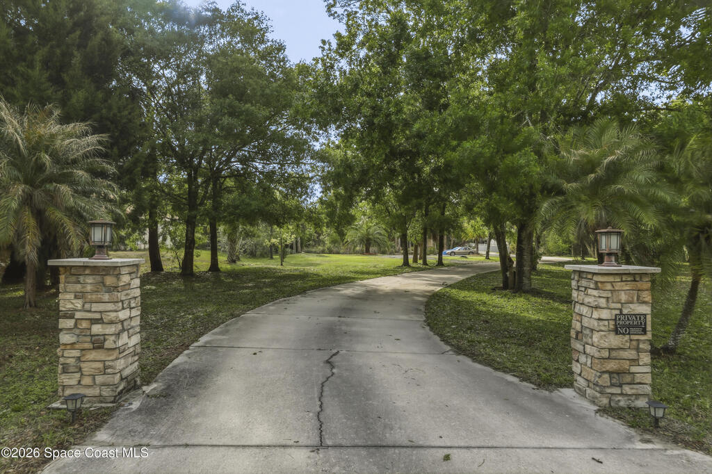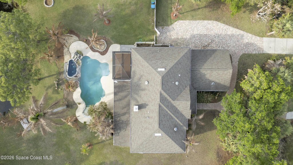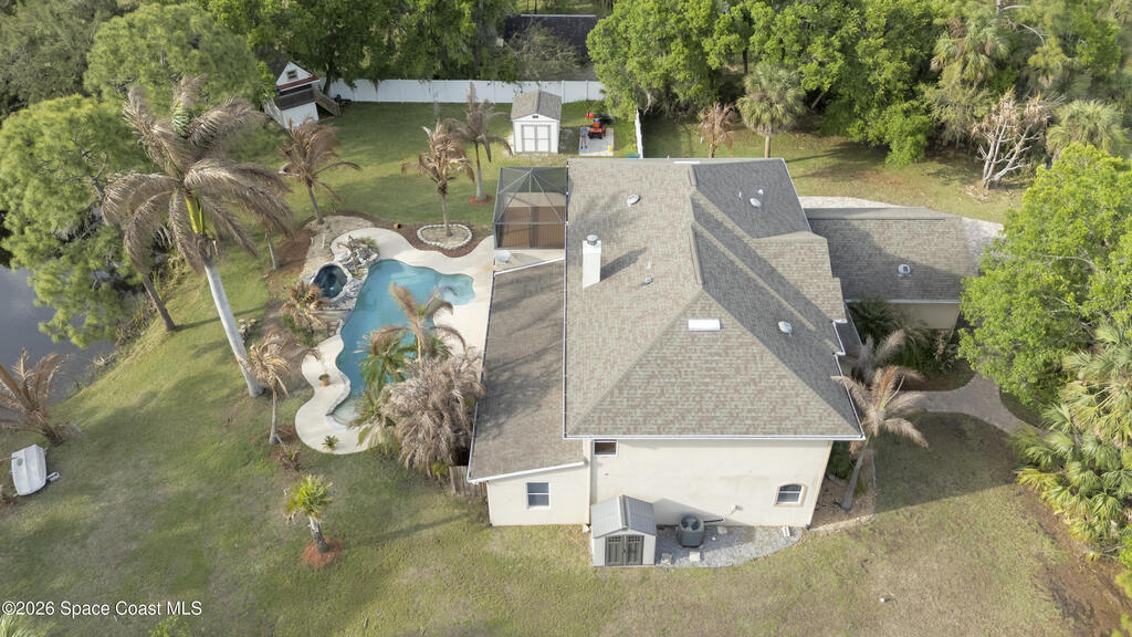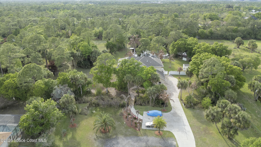 Set on 3.2 acres of serene land, this exceptional estate is surrounded by mature specimen trees, creating a peaceful setting with natural beauty. The home features 5 bed. & 4 bath., highlighted by a double-height living room filled with natural light and a desirable first-floor primary bedroom with ensuite. An additional cabana bathroom for convenient outdoor living. Enjoy an organically designed saltwater pool and spa that blends beautifully with the landscape, perfect for relaxing or entertaining. A spacious media/family room opens to a screened terrace overlooking the entire property, offering tranquil views. Additional features include two A/C units, laundry rooms on both floors, central vacuum, and a three-car garage with high ceilings ideal for a lift. The property also includes two sheds & a separate two-story storage building. With full road access & a rear right-of-way, it easily accommodates RVs, boats, or equipment, all in a private setting near the Palm Bay-Melbourne area