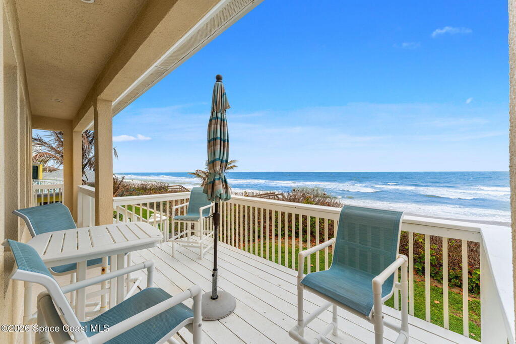 Majestic furnished oceanfront beauty is a must see! Be impressed with gourmet kitchen boasting granite tops, S/S appliances + gas range all opening to family room and dining room all w/awesome ocean views! Large guest bedroom on first level plus full bath. Second floor has 3 bedrooms, big living room w/maple wood floors, wet bar + gas fireplace plus tall windows that offer incredible views of ocean. Spacious pavered patio w/pool in large backyard. BUILT strong, SOLID Concrete block on both levels/tile roof + impact glass PLUS hurricane shutters on all impact sliding doors! Extended 2nd floor balcony w/stairs that lead to big backyard + sandy, quiet beach! Marble flooring, maple wood floors and wine cellar. BOTH A/C's just replaced inside and out. South Shores community water. Big two car side loading garage and big pavered driveway to turn around easily. Located in best location in Melbourne Beach with estate ocean front homes all around. NO HOA fees! Endless sandy beach awaits you!