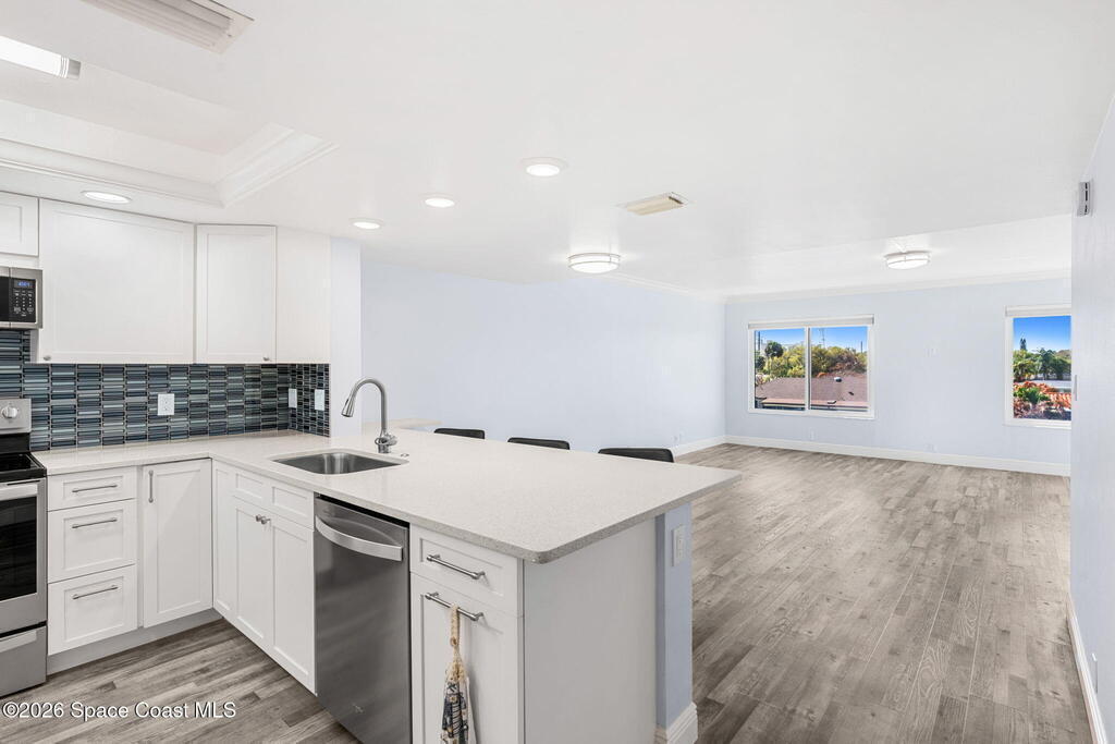 Take in breathtaking western sunset views from this updated3/2 penthouse condo, offering the perfect blend of comfort, style, and waterfront living. Included is a deeded boat slip accommodating up to a 23-foot boat, making it ideal for boating enthusiasts. New impact windows, sliders 2018, milestone and SIRS completed by HOA. Recent updates include custom frameless soft close kitchen cabinets, Quartz surfaces ,stainless steel appliances, updated vinyl plank flooring, custom glass shower enclosures in both bathrooms, a new A/C (2022), and a new hot water heater (2024). The washer and dryer have also been updated and may be stacked for added space and efficiency. This is a rare chance to own a penthouse retreat with stunning sunset views and direct boating convenience. Condo complex also offers a heated inground pool and deeded shared garage space.