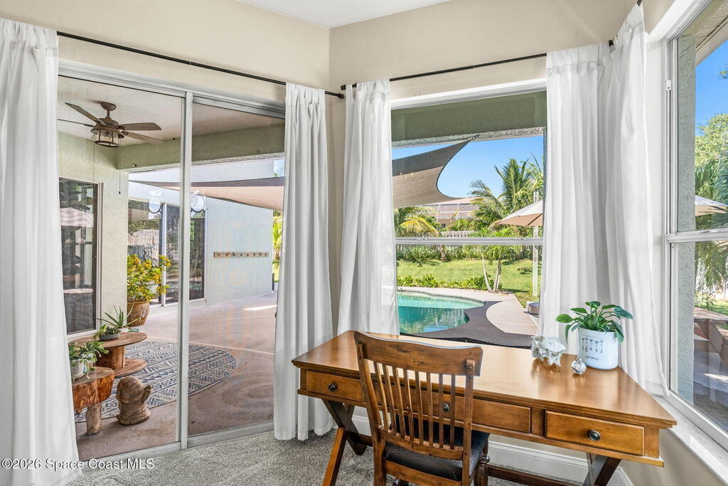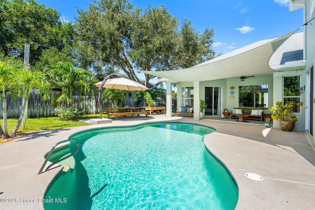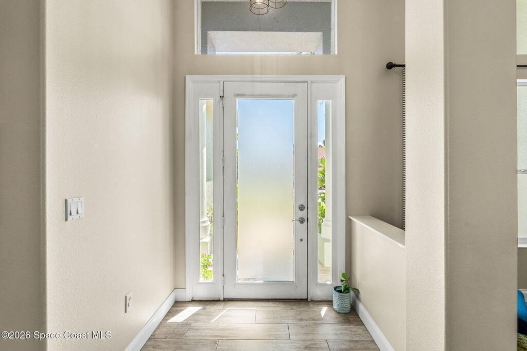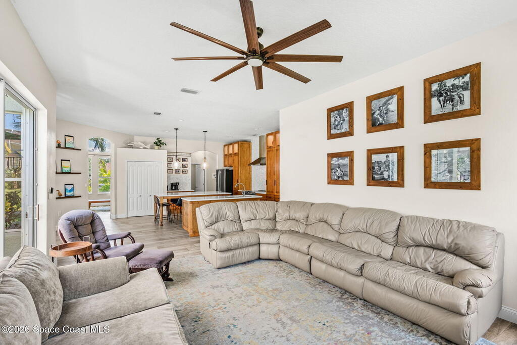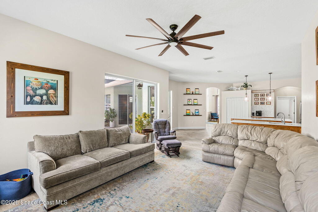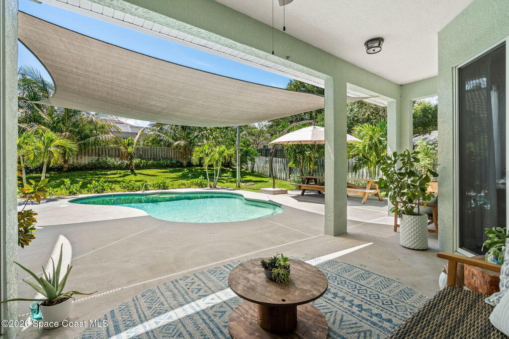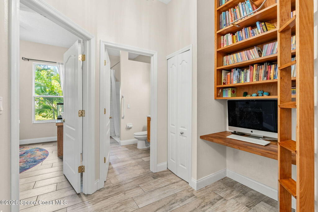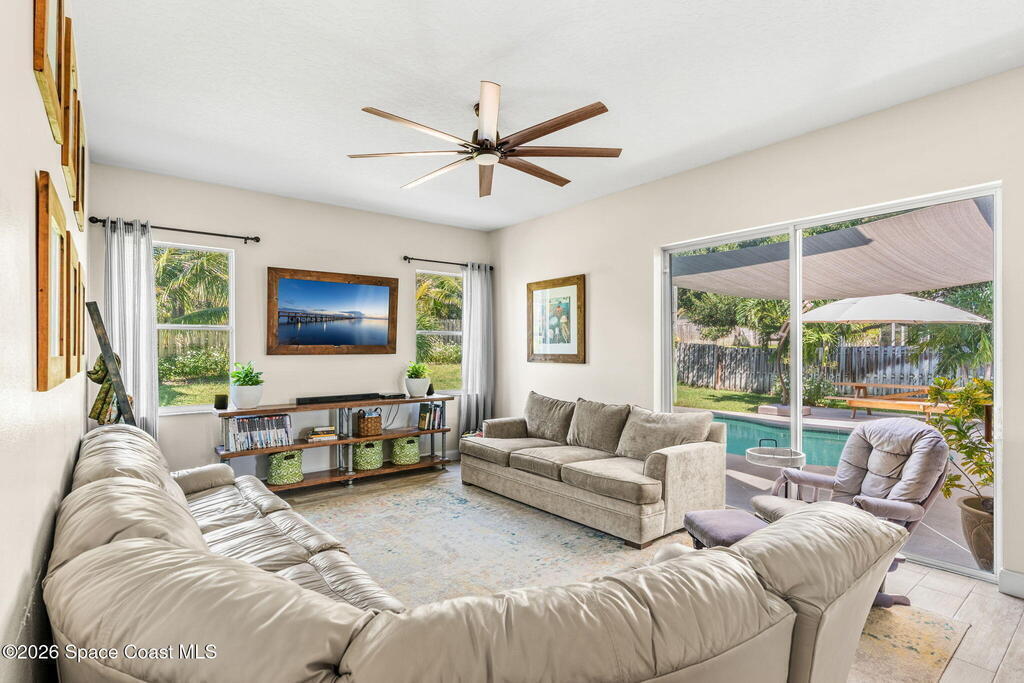 Located in the sought-after River Grove subdivision of South Merritt Island, this 5 bed, 3.5 bath pool home offers style, function, & an impressive list of upgrades. Inside, porcelain wood tile flows through the main living areas, complemented by high ceilings (10' in bedrooms & 12' in main spaces). The custom kitchen features quartz countertops, a large island, decorative tile backsplash, & cabinets w/ ample storage. A custom-built bookshelf w/ sliding ladder & computer desk adds character, while a spacious loft upstairs & a fifth bedroom w/ added half bath provide versatility. The primary suite boasts a barn door on bathroom entry for privacy, garden tub, step-in shower, dual vanities, & sliders to the pool. Bathrooms feature floating vanities, w/ a new quartz-topped vanity in the pool bath. Outdoors, enjoy a sun-shaded saltwater pool w/ warm-water shower, extended concrete patio, lush coconut palms, & a river rock-accented front porch.