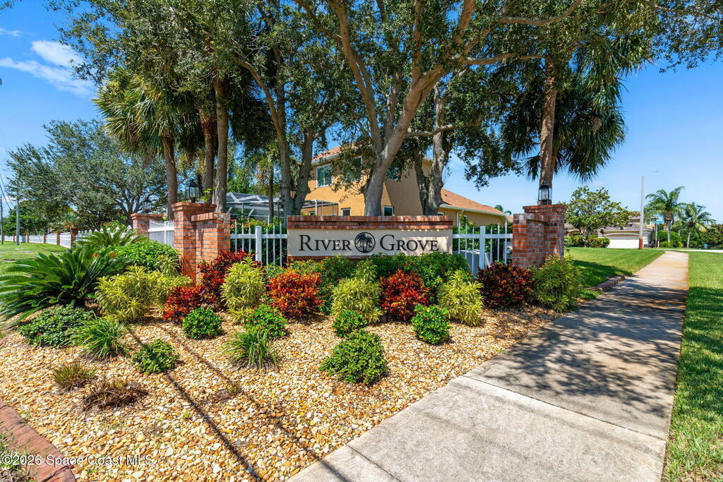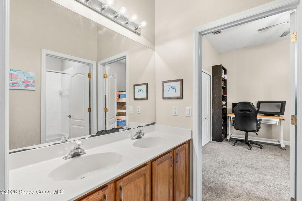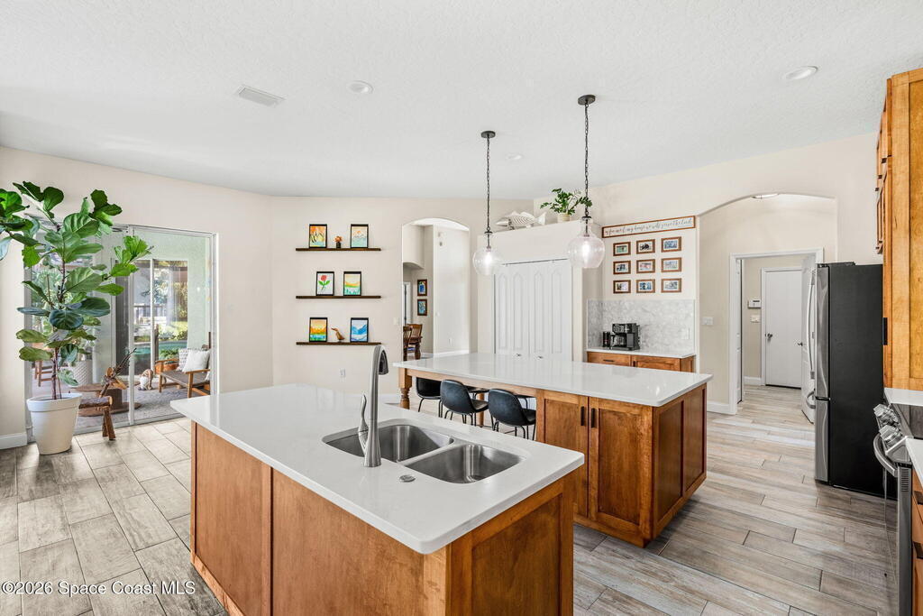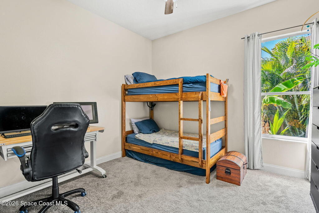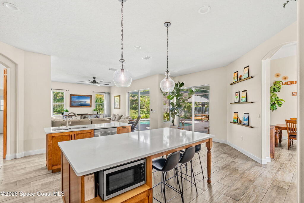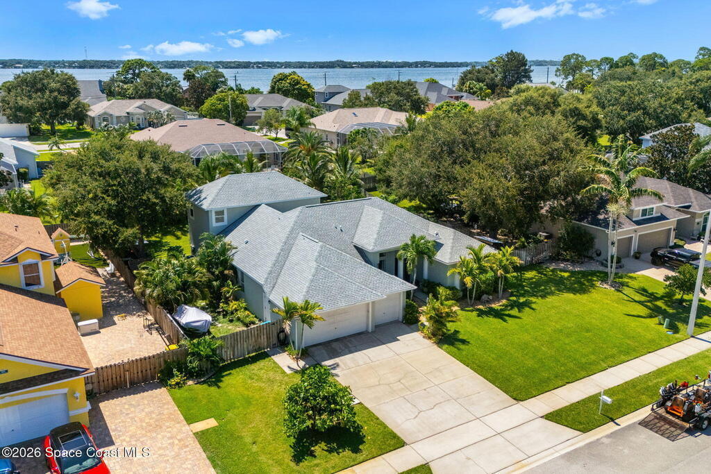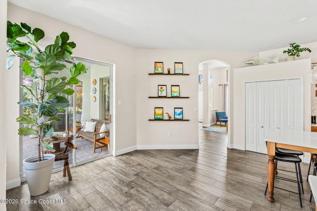 Located in the sought-after River Grove subdivision of South Merritt Island, this 5 bed, 3.5 bath pool home offers style, function, & an impressive list of upgrades. Inside, porcelain wood tile flows through the main living areas, complemented by high ceilings (10' in bedrooms & 12' in main spaces). The custom kitchen features quartz countertops, a large island, decorative tile backsplash, & cabinets w/ ample storage. A custom-built bookshelf w/ sliding ladder & computer desk adds character, while a spacious loft upstairs & a fifth bedroom w/ added half bath provide versatility. The primary suite boasts a barn door on bathroom entry for privacy, garden tub, step-in shower, dual vanities, & sliders to the pool. Bathrooms feature floating vanities, w/ a new quartz-topped vanity in the pool bath. Outdoors, enjoy a sun-shaded saltwater pool w/ warm-water shower, extended concrete patio, lush coconut palms, & a river rock-accented front porch.