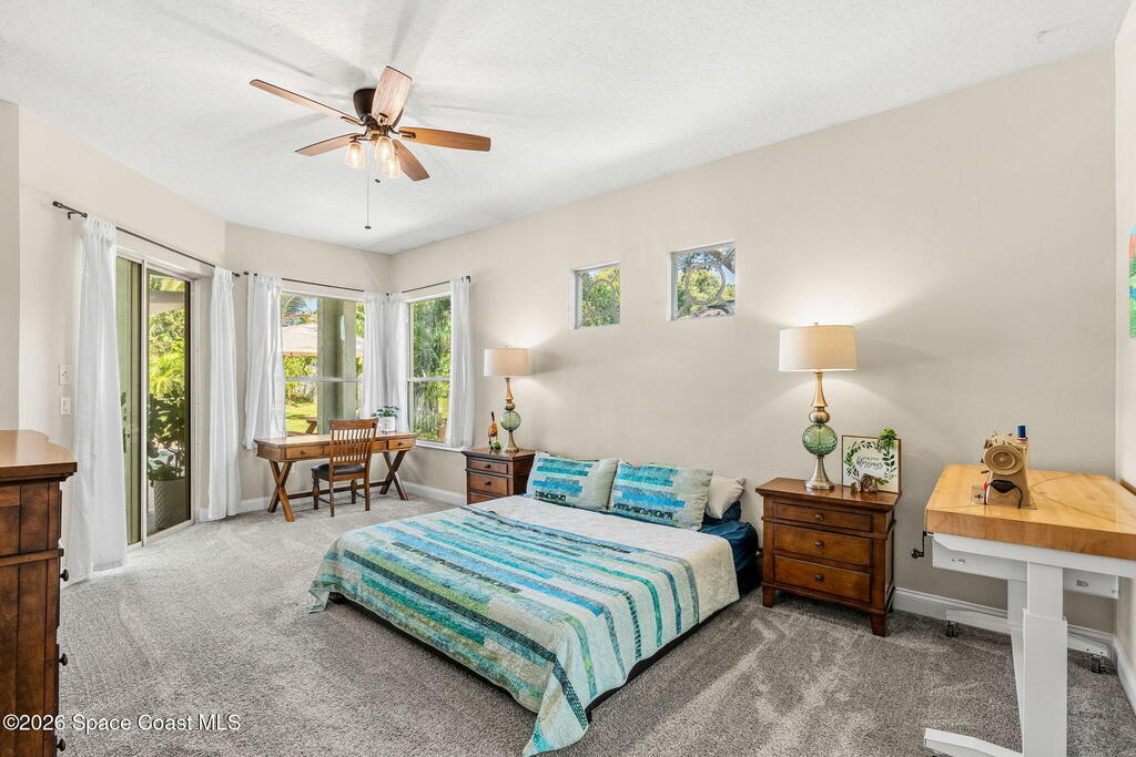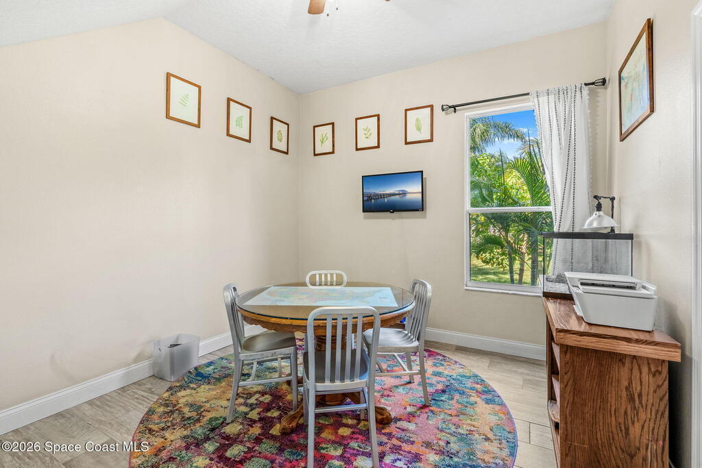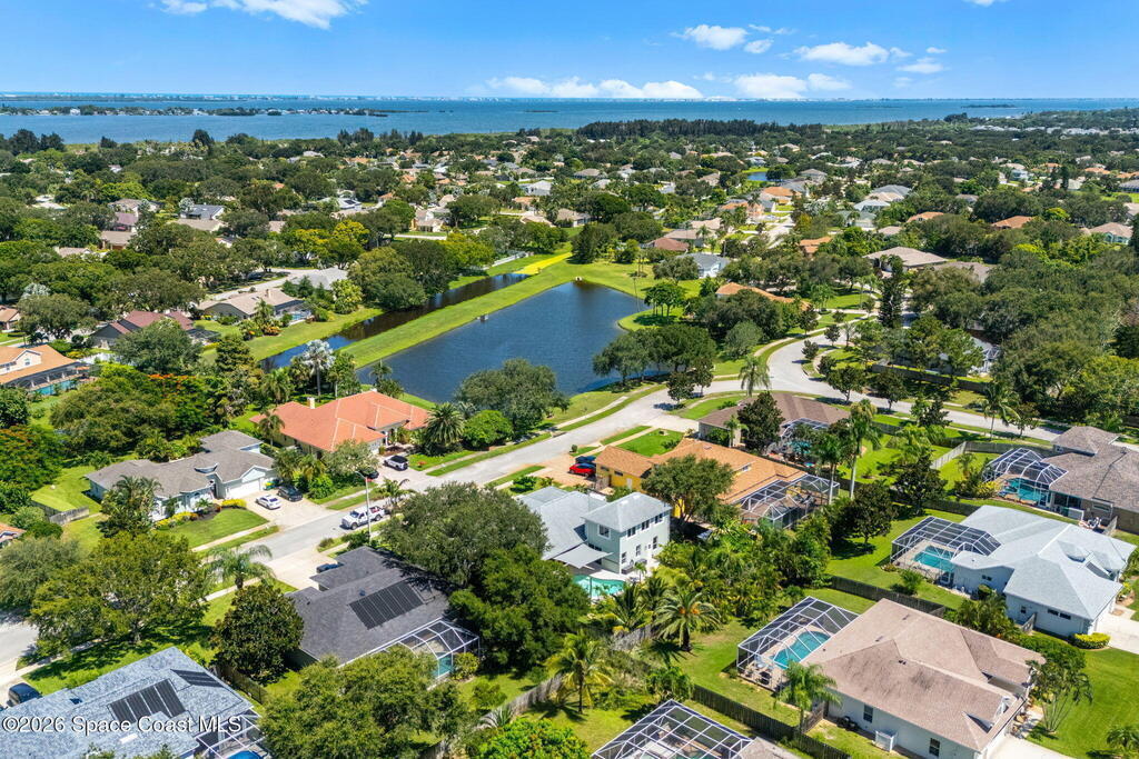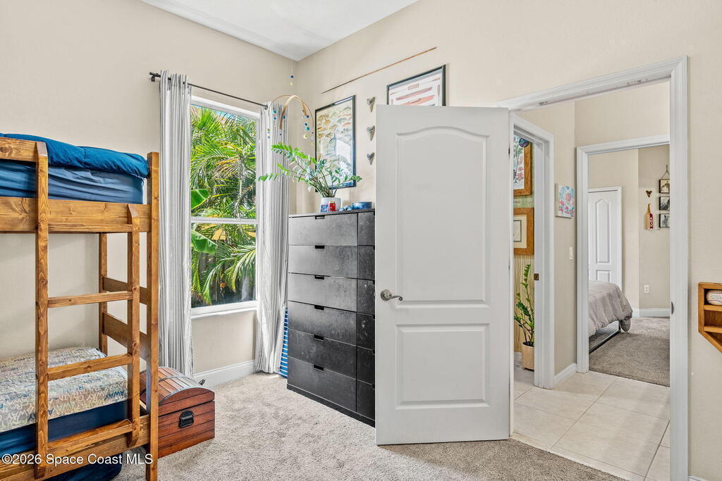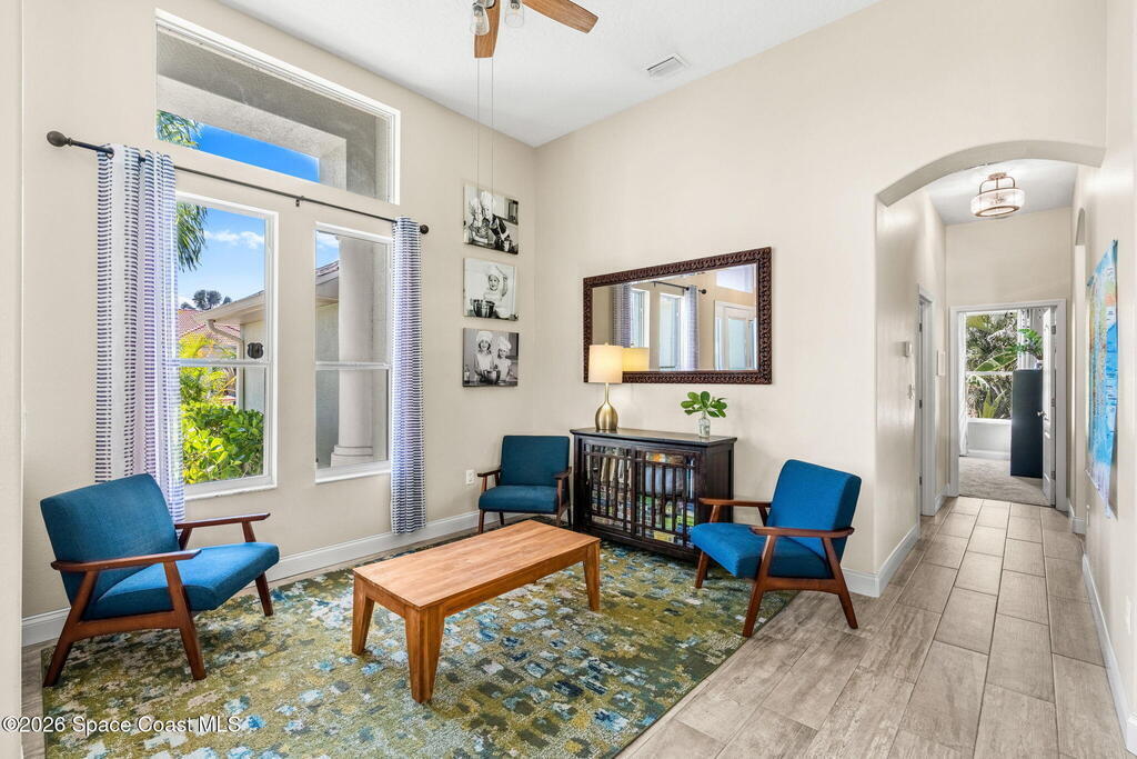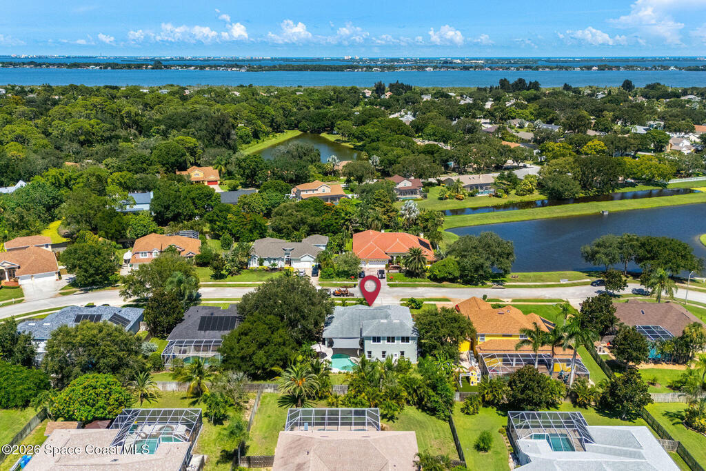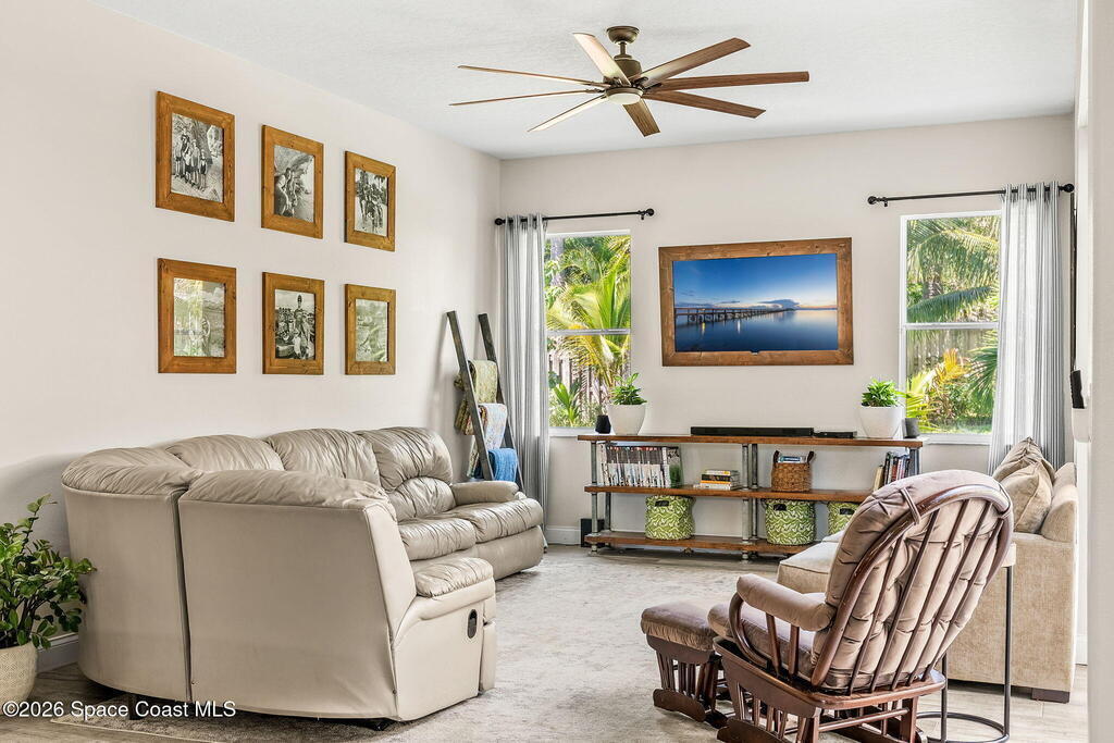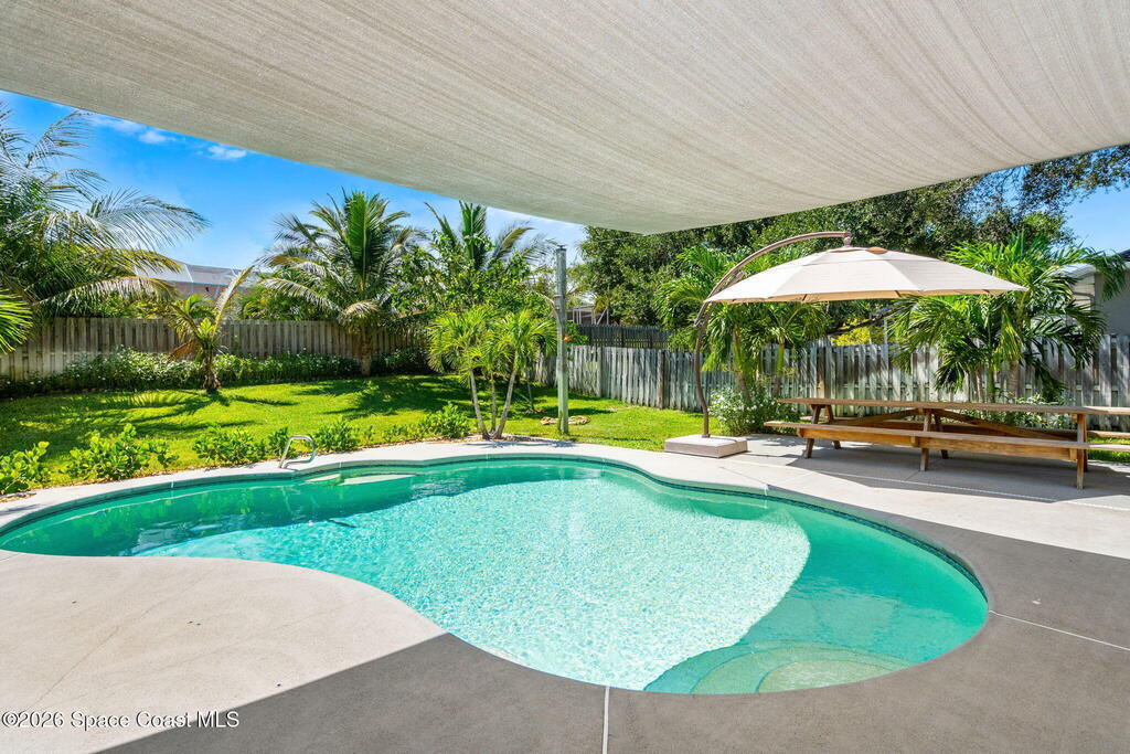 Located in the sought-after River Grove subdivision of South Merritt Island, this 5 bed, 3.5 bath pool home offers style, function, & an impressive list of upgrades. Inside, porcelain wood tile flows through the main living areas, complemented by high ceilings (10' in bedrooms & 12' in main spaces). The custom kitchen features quartz countertops, a large island, decorative tile backsplash, & cabinets w/ ample storage. A custom-built bookshelf w/ sliding ladder & computer desk adds character, while a spacious loft upstairs & a fifth bedroom w/ added half bath provide versatility. The primary suite boasts a barn door on bathroom entry for privacy, garden tub, step-in shower, dual vanities, & sliders to the pool. Bathrooms feature floating vanities, w/ a new quartz-topped vanity in the pool bath. Outdoors, enjoy a sun-shaded saltwater pool w/ warm-water shower, extended concrete patio, lush coconut palms, & a river rock-accented front porch.