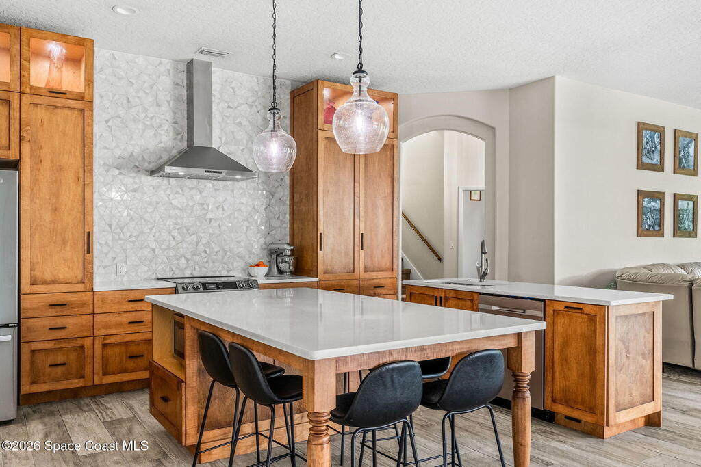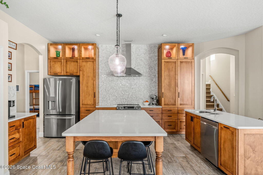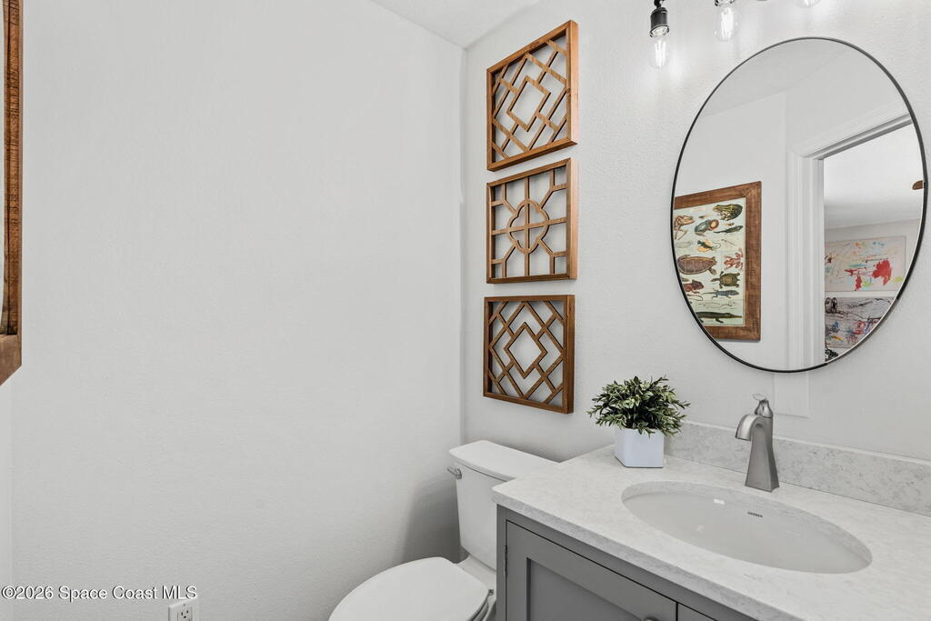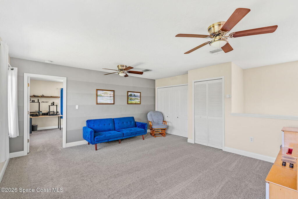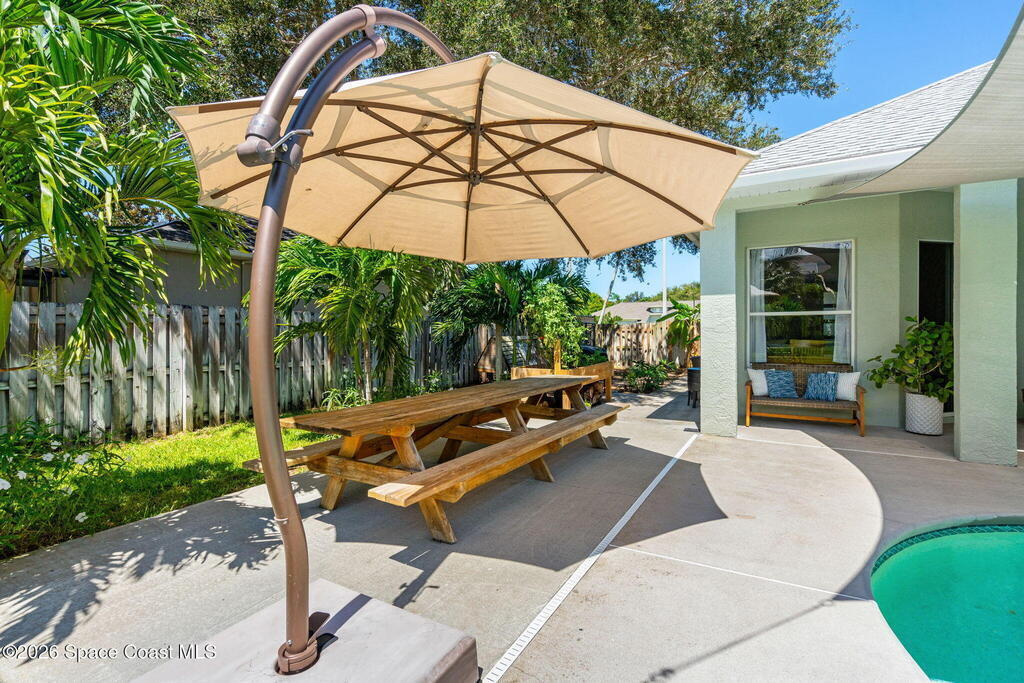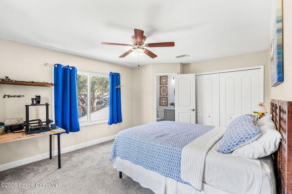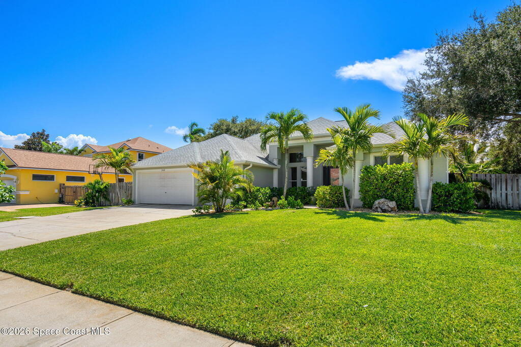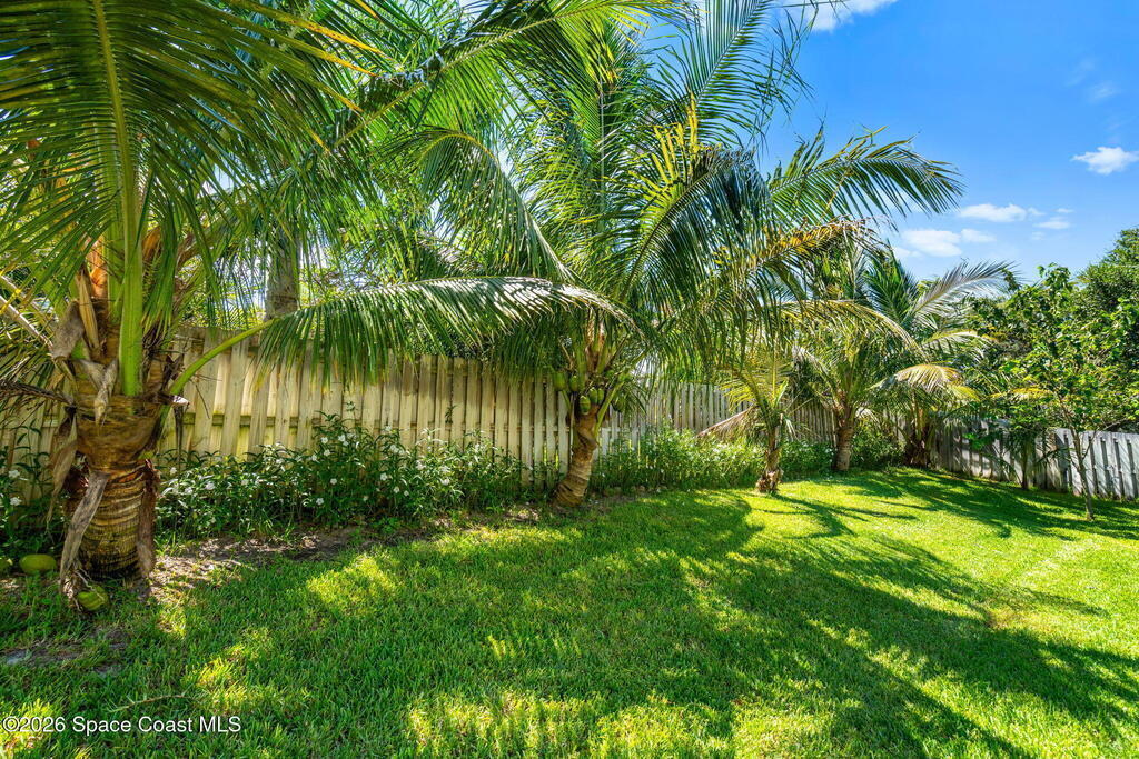 Located in the sought-after River Grove subdivision of South Merritt Island, this 5 bed, 3.5 bath pool home offers style, function, & an impressive list of upgrades. Inside, porcelain wood tile flows through the main living areas, complemented by high ceilings (10' in bedrooms & 12' in main spaces). The custom kitchen features quartz countertops, a large island, decorative tile backsplash, & cabinets w/ ample storage. A custom-built bookshelf w/ sliding ladder & computer desk adds character, while a spacious loft upstairs & a fifth bedroom w/ added half bath provide versatility. The primary suite boasts a barn door on bathroom entry for privacy, garden tub, step-in shower, dual vanities, & sliders to the pool. Bathrooms feature floating vanities, w/ a new quartz-topped vanity in the pool bath. Outdoors, enjoy a sun-shaded saltwater pool w/ warm-water shower, extended concrete patio, lush coconut palms, & a river rock-accented front porch.